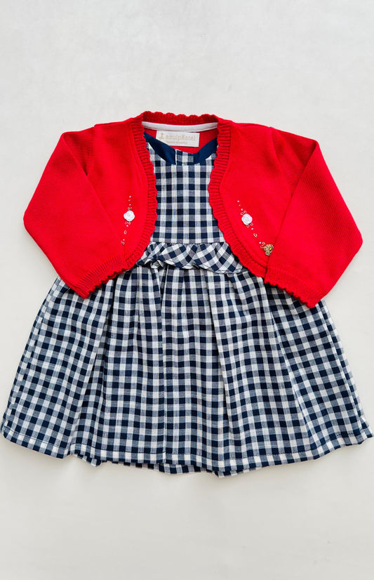 Vestido Cuadros Azul con Saquito Rojo Bordado