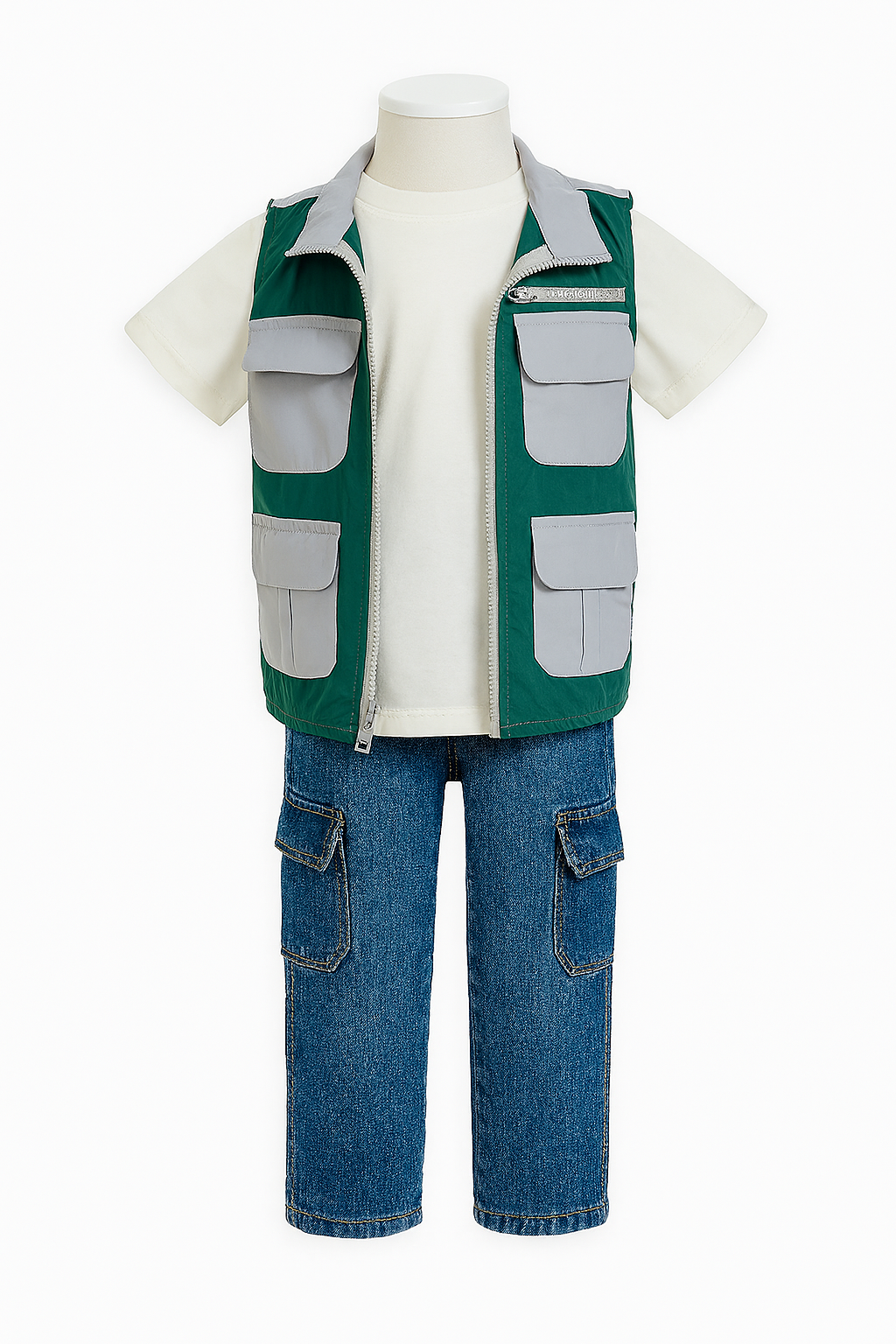 Conjunto casual de tres piezas para niño, compuesto por una camiseta básica, un chaleco con prácticos bolsillos frontales y cierre, y un pantalón tipo jean con dobladillo enrollado. Es una opción versátil y cómoda para el día a día, perfecta para explorar y jugar con total libertad.