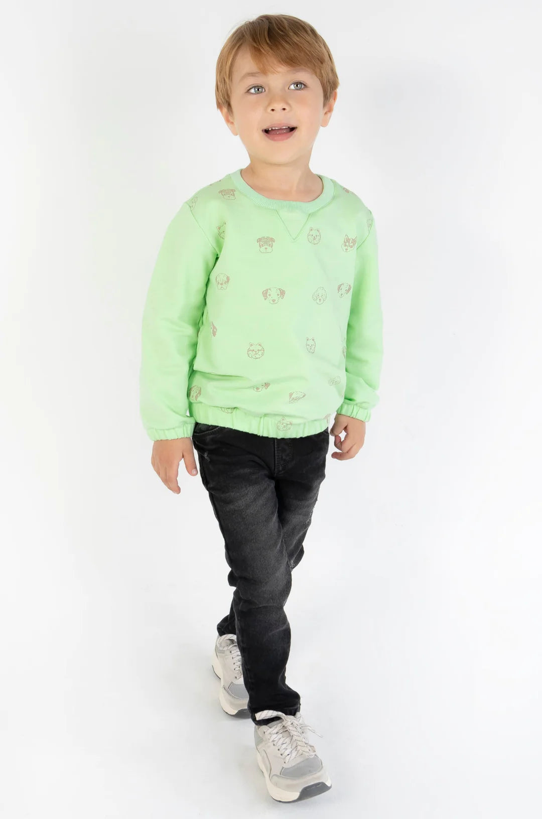 Conjunto para niño que combina un suéter con divertidos estampados de pequeños rostros de mascotas y un pantalón tipo denim con ajuste cómodo. El suéter tiene puños y pretina elásticos que aseguran libertad de movimiento, mientras que el pantalón ofrece un look casual y resistente, perfecto para acompañar a tu pequeño en sus juegos y salidas.