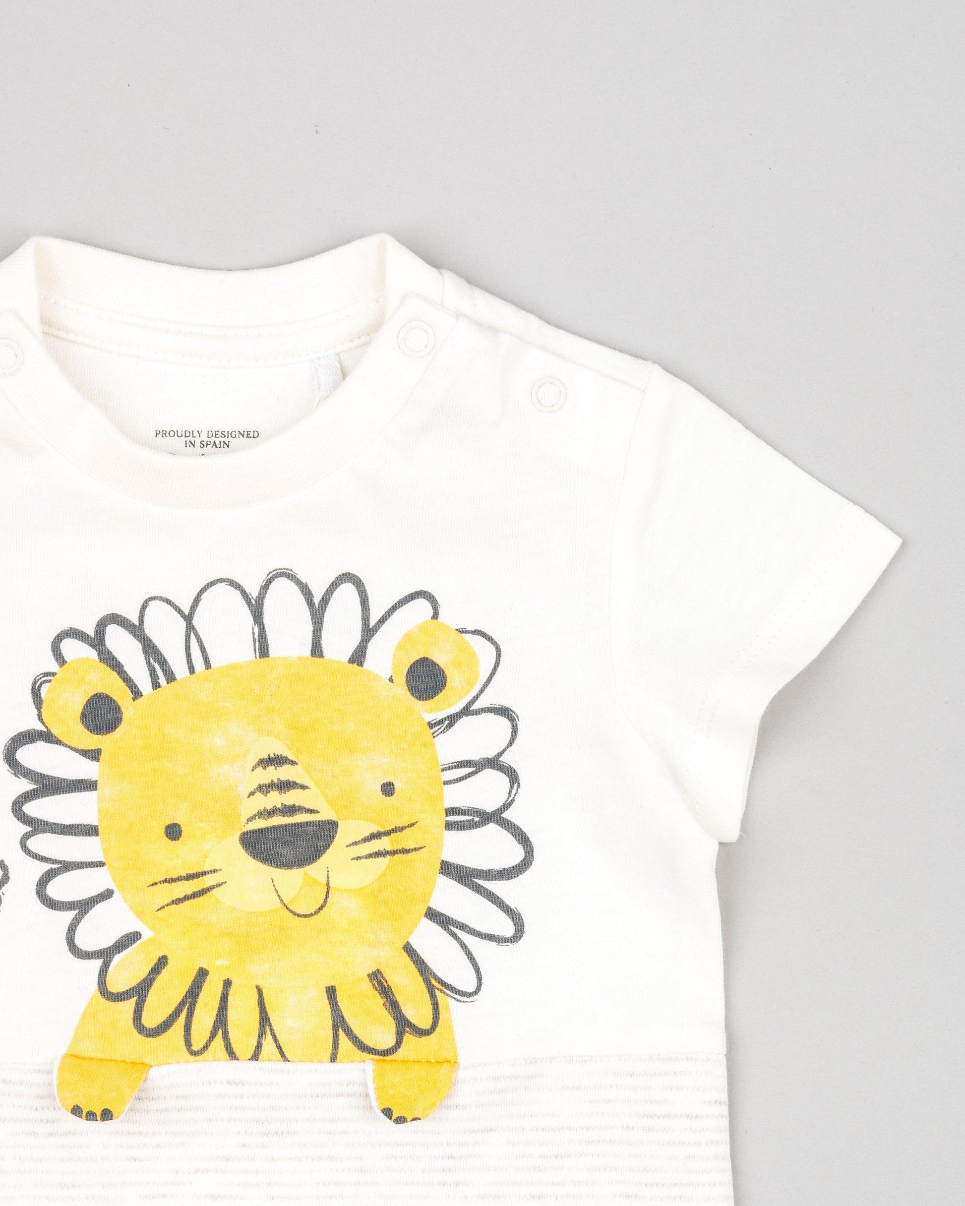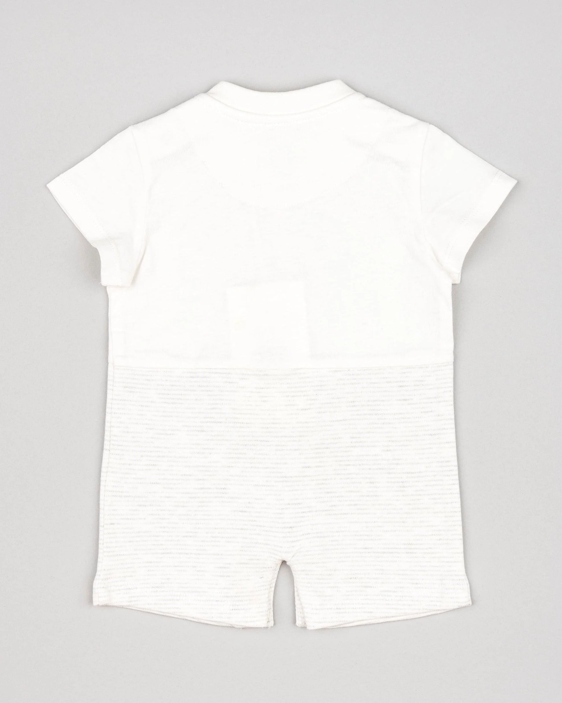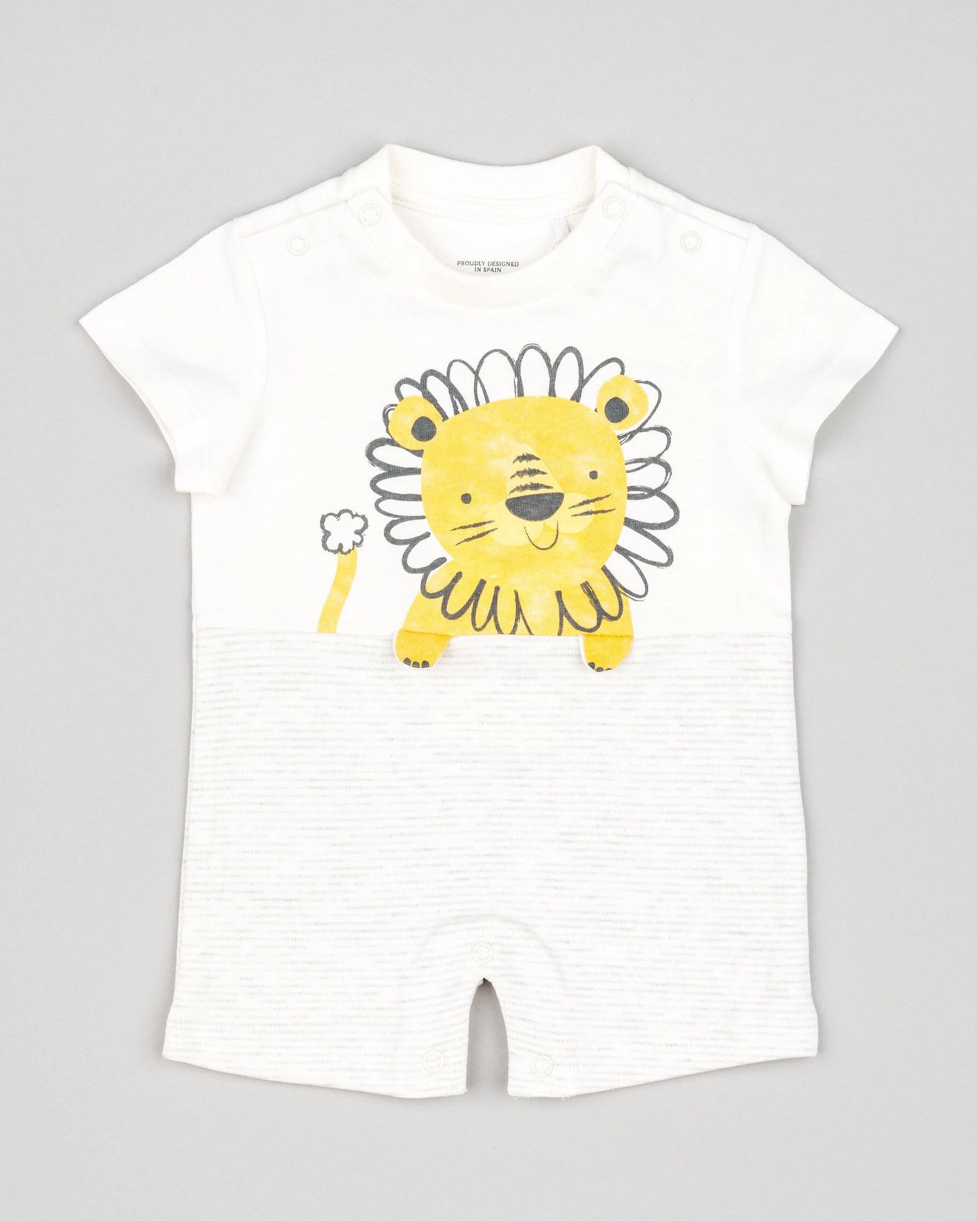 Enterizo blanco con diseño tierno en tonos suaves, perfecto para días cálidos. En la parte superior luce un estampado alegre y simpático, acompañado de pantalón corto en textura de rayas finas que aporta un toque delicado y moderno. Ideal para mantener a tu bebé cómodo y con mucho estilo.
