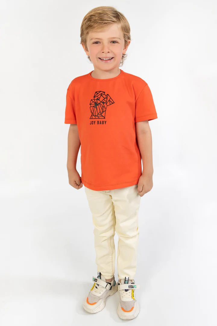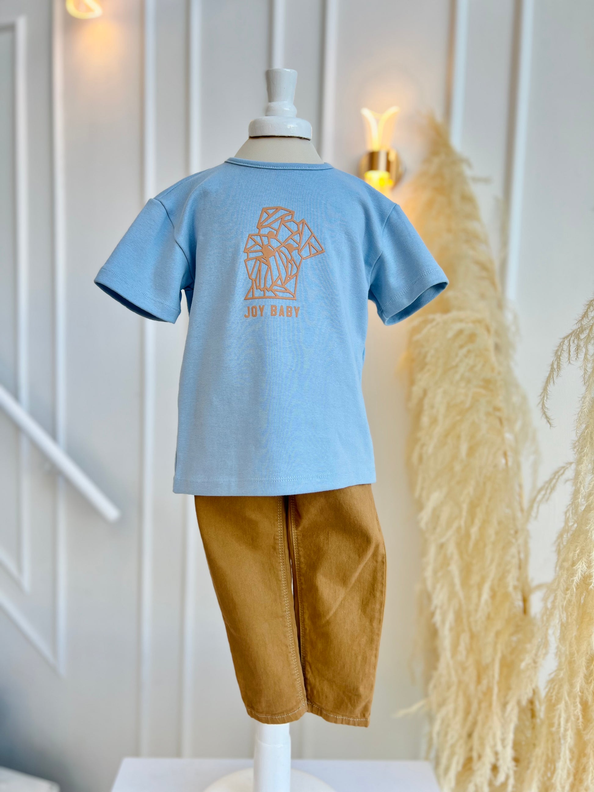 Conjunto de dos piezas para niño, compuesto por una camiseta con estampado geométrico en la parte posterior y un pantalón ligero tipo jogger. Un look moderno y cómodo, ideal para el día a día o para salidas informales, que aporta un toque divertido y urbano al guardarropa de tu pequeño.