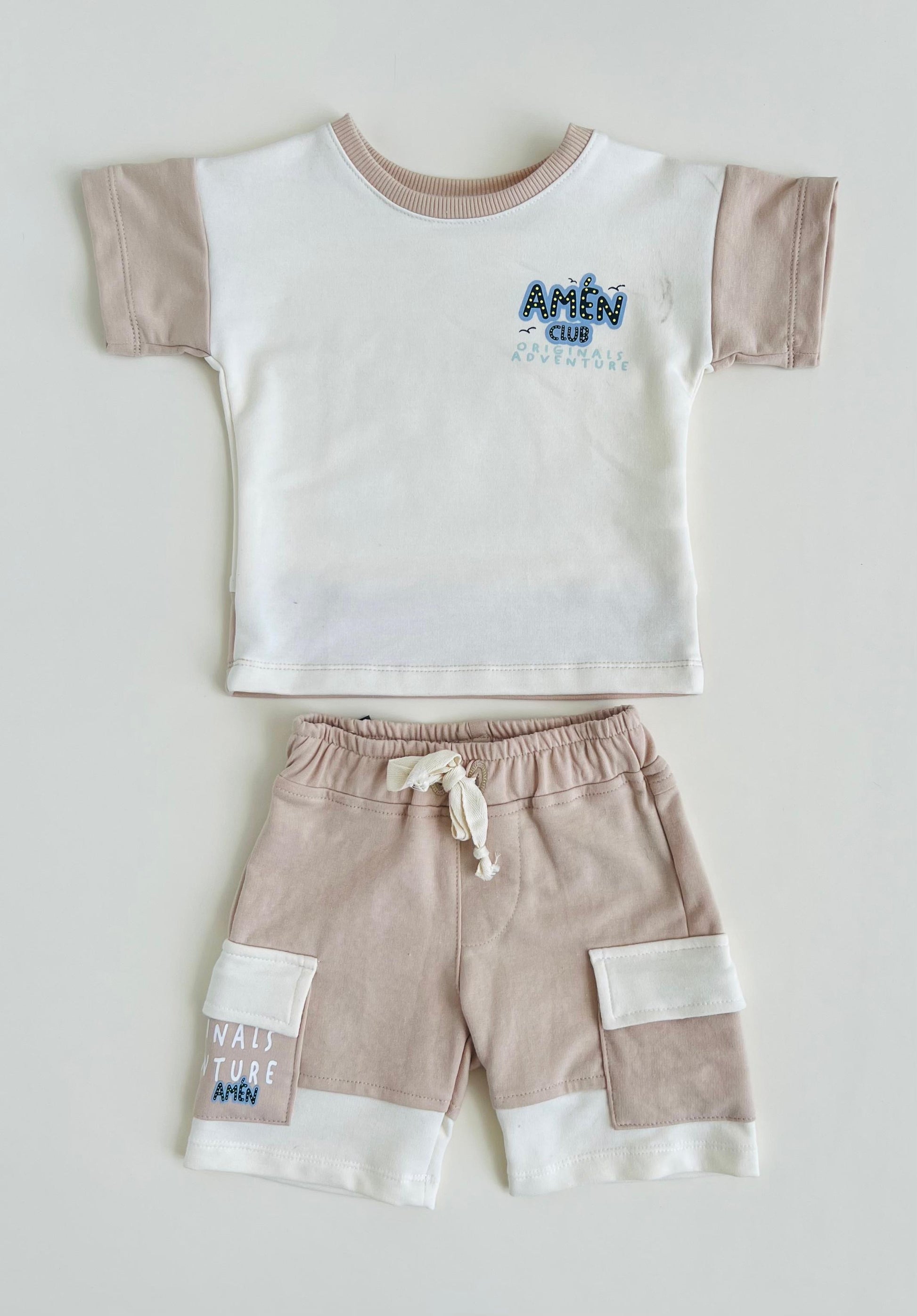 Este encantador set para niño combina estilo y diversión en una propuesta cómoda y moderna. Incluye una camiseta en varios tonos con mangas contrastantes y un estampado posterior vibrante de tablas de surf y señalizaciones playeras que evocan un espíritu aventurero. El diseño resalta el lema “AMÉN CLUB Originals Adventure”, ideal para pequeños exploradores.