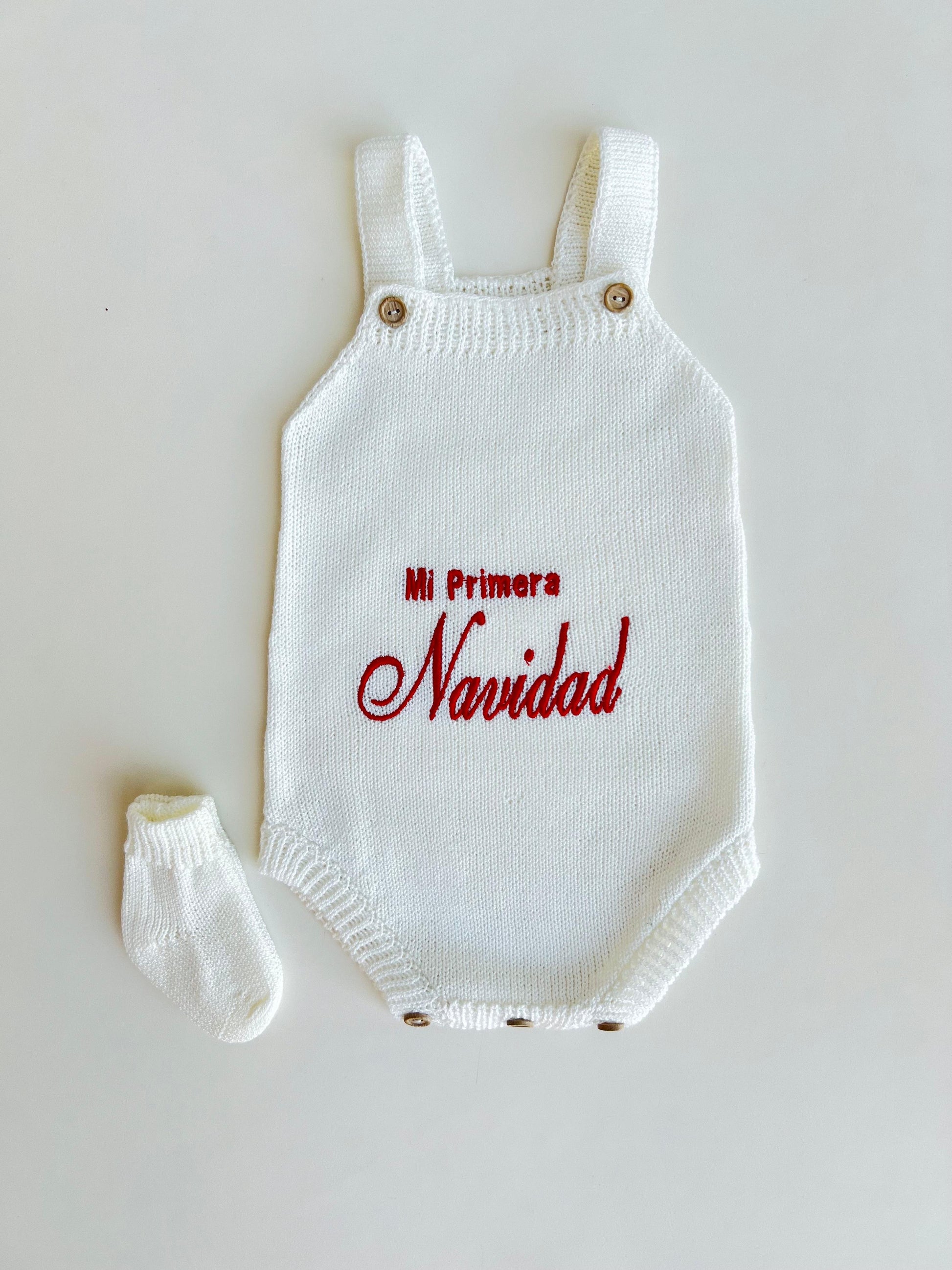 Su diseño clásico incluye tirantes con botones de madera, bordado frontal con la frase “Mi Primera Navidad” y un cierre inferior con botones para facilitar el cambio de pañal. Viene acompañado de un par de medias tejidas a juego que completan el look con un toque tierno y armonioso.