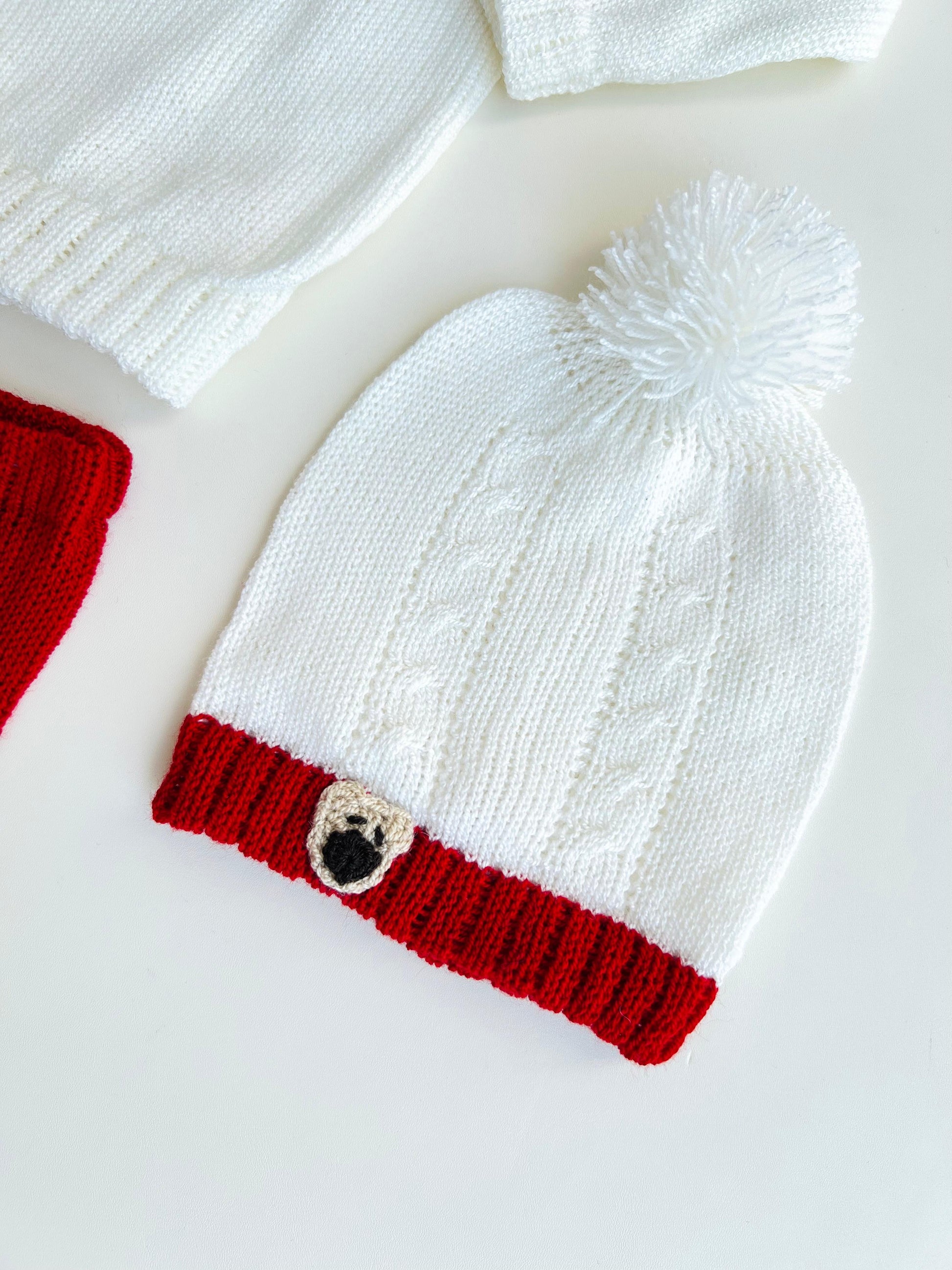 • Gorro tejido con pompón y detalle decorativo frontal a juego con el suéter, ideal para completar el look y mantenerlo abrigado.