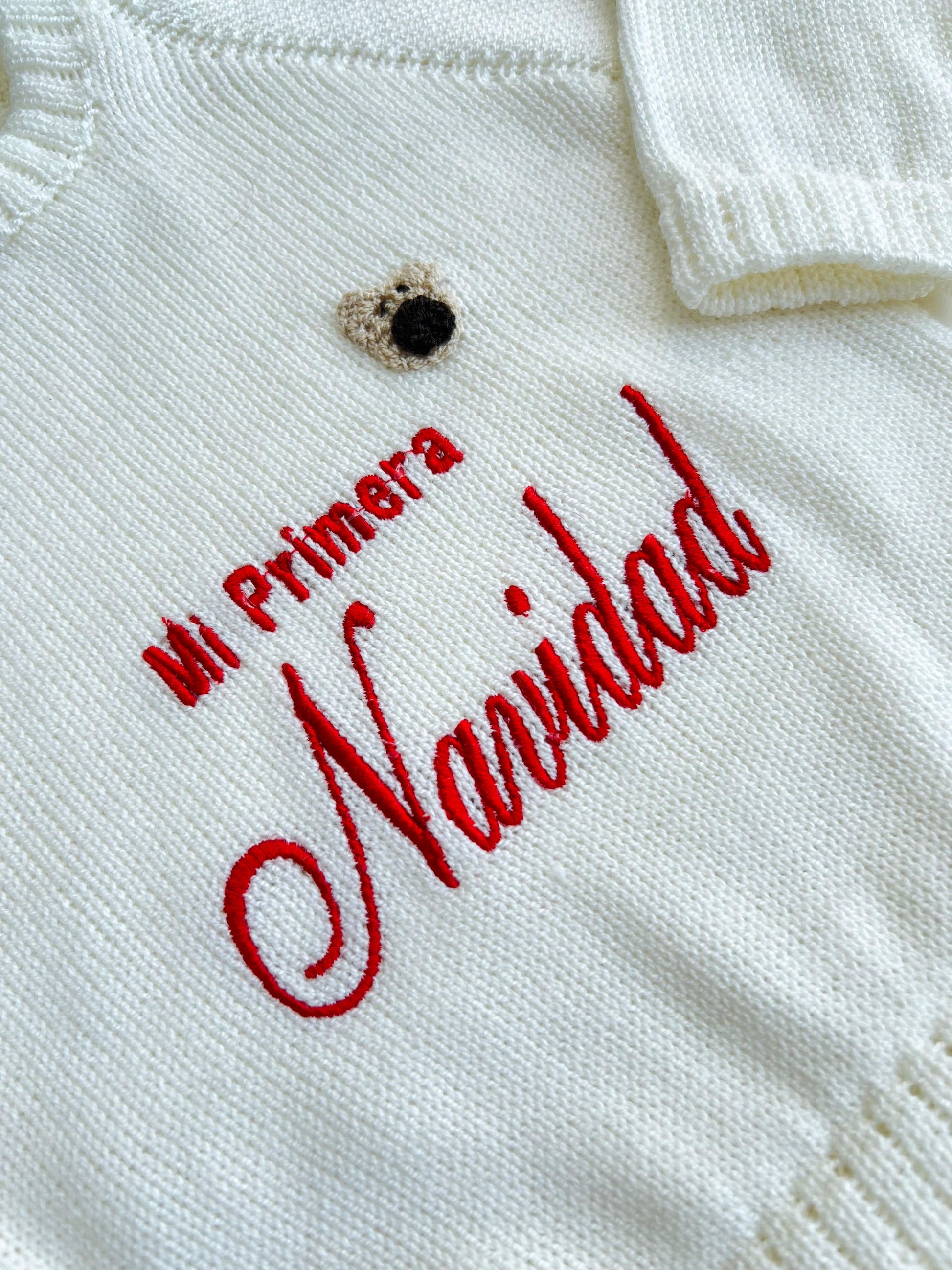 • Suéter tejido en tono claro con la frase “Mi Primera Navidad” bordada en hilo rojo y un pequeño aplique decorativo tejido. Cuenta con cuello, puños y basta acanalados para un mejor ajuste y botón posterior para facilitar el cambio.