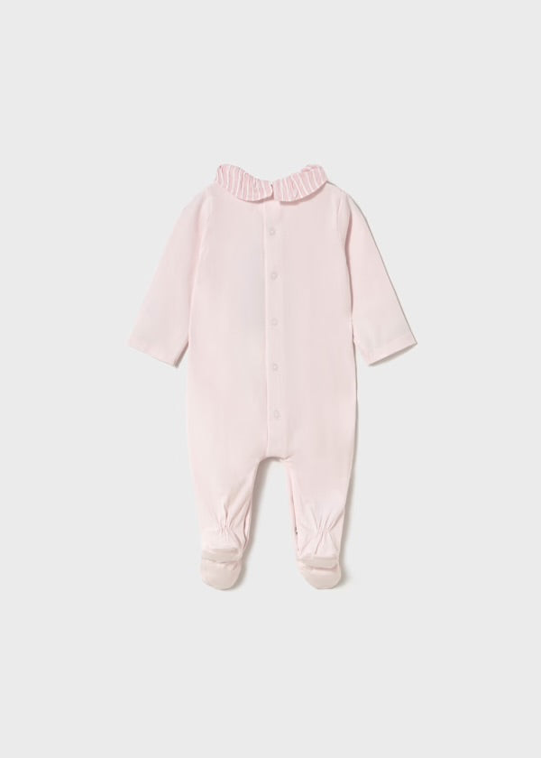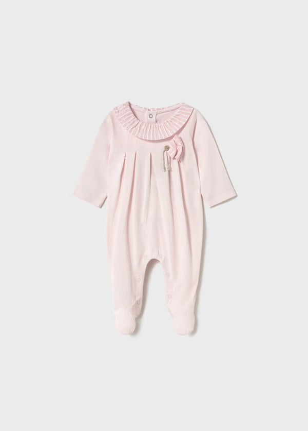 Pijama de manga larga para recién nacido. Diseño con pies. Cuello redondo con volante. Cierre con botones a presión en la parte posterior. Cierre con botones en la entrepierna. Las tallas mayores de este modelo (12 y 18 meses) presentan una suela antideslizante.