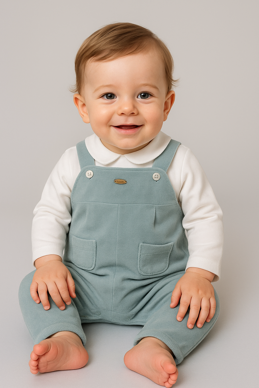 Pelele de manga larga para recién nacido. Diseño con peto simulado en superposición. Cierre con botones a presión en la parte posterior. Botones a presión en la entrepierna para facilitar la puesta de la prenda. Cálido tejido de punto pana de gran comodidad y suavidad. En este modelo las tallas mayores (de 6-9 a 18 meses) no llevan pies, para facilitar una mejor movilidad del bebé y mayor confort en el uso.