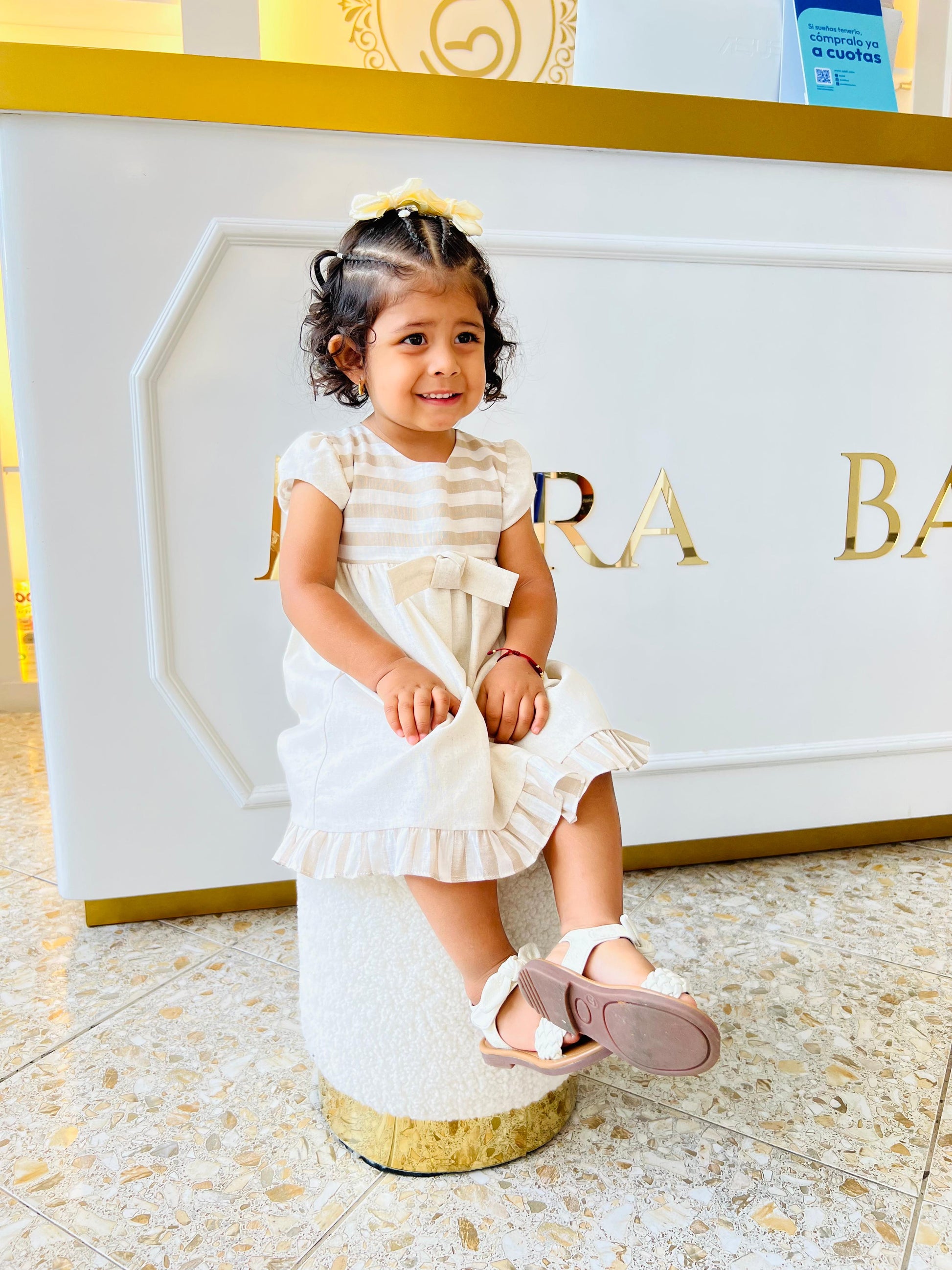 Este adorable vestido es perfecto para un look fresco y elegante. Tiene un diseño con el cuerpo en delicadas rayas, acompañado de mangas cortas ligeramente abullonadas que le dan un aire dulce. En la cintura destaca un coqueto lazo que realza el diseño, mientras que el bajo con volante en el mismo estampado a rayas aporta movimiento y un acabado encantador. Confeccionado en un tejido suave y ligero, es ideal para que tu pequeña disfrute cómoda en cualquier ocasión especial o en su día a día.