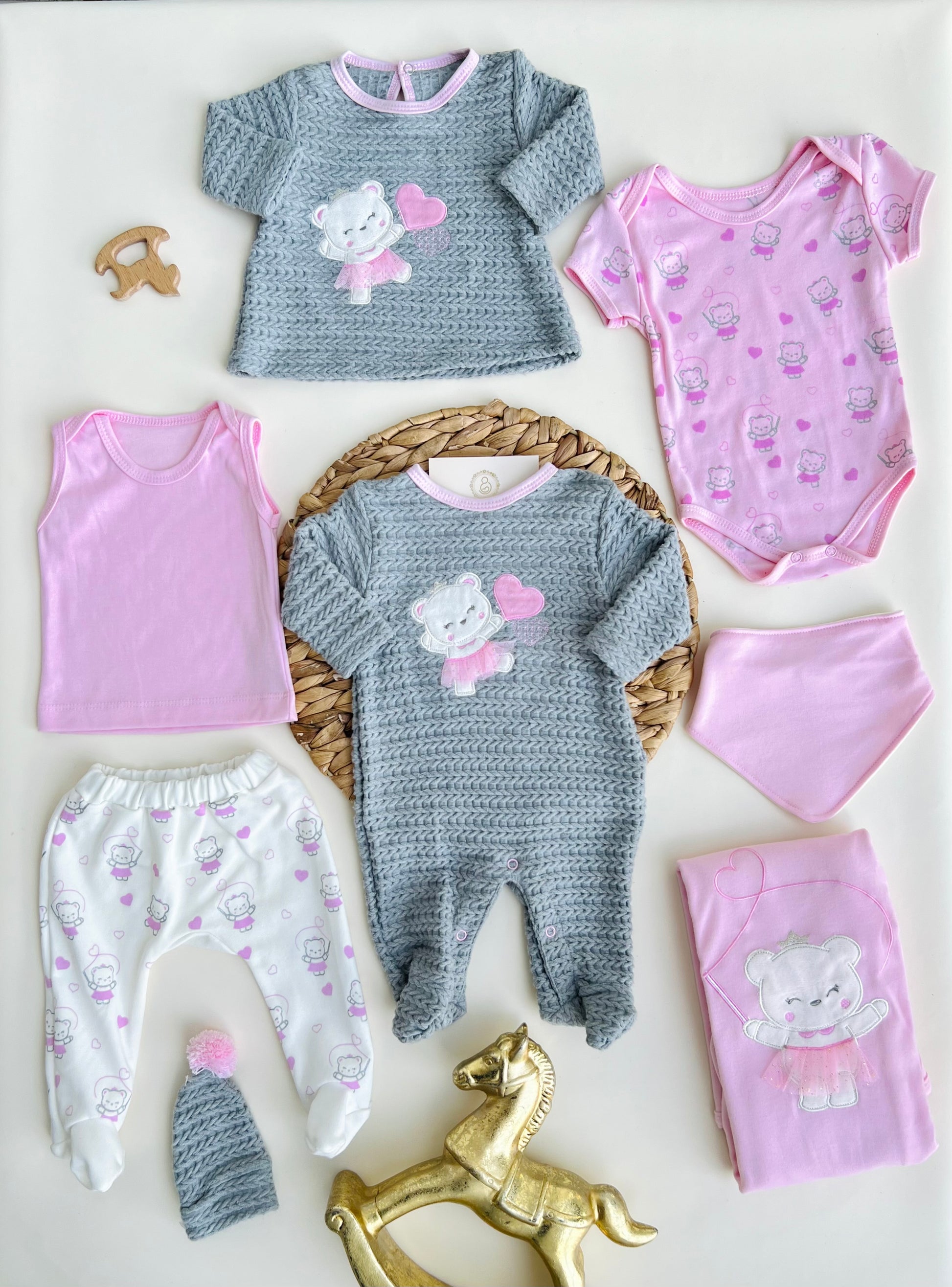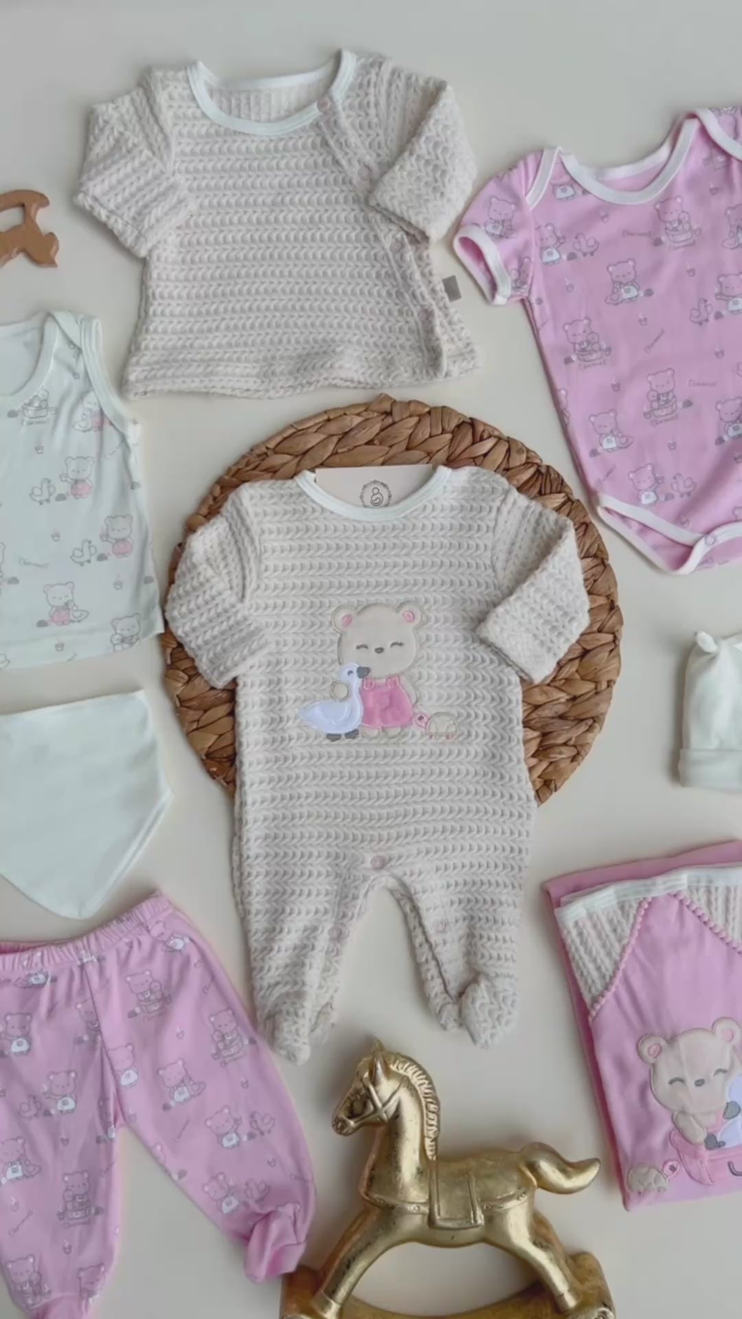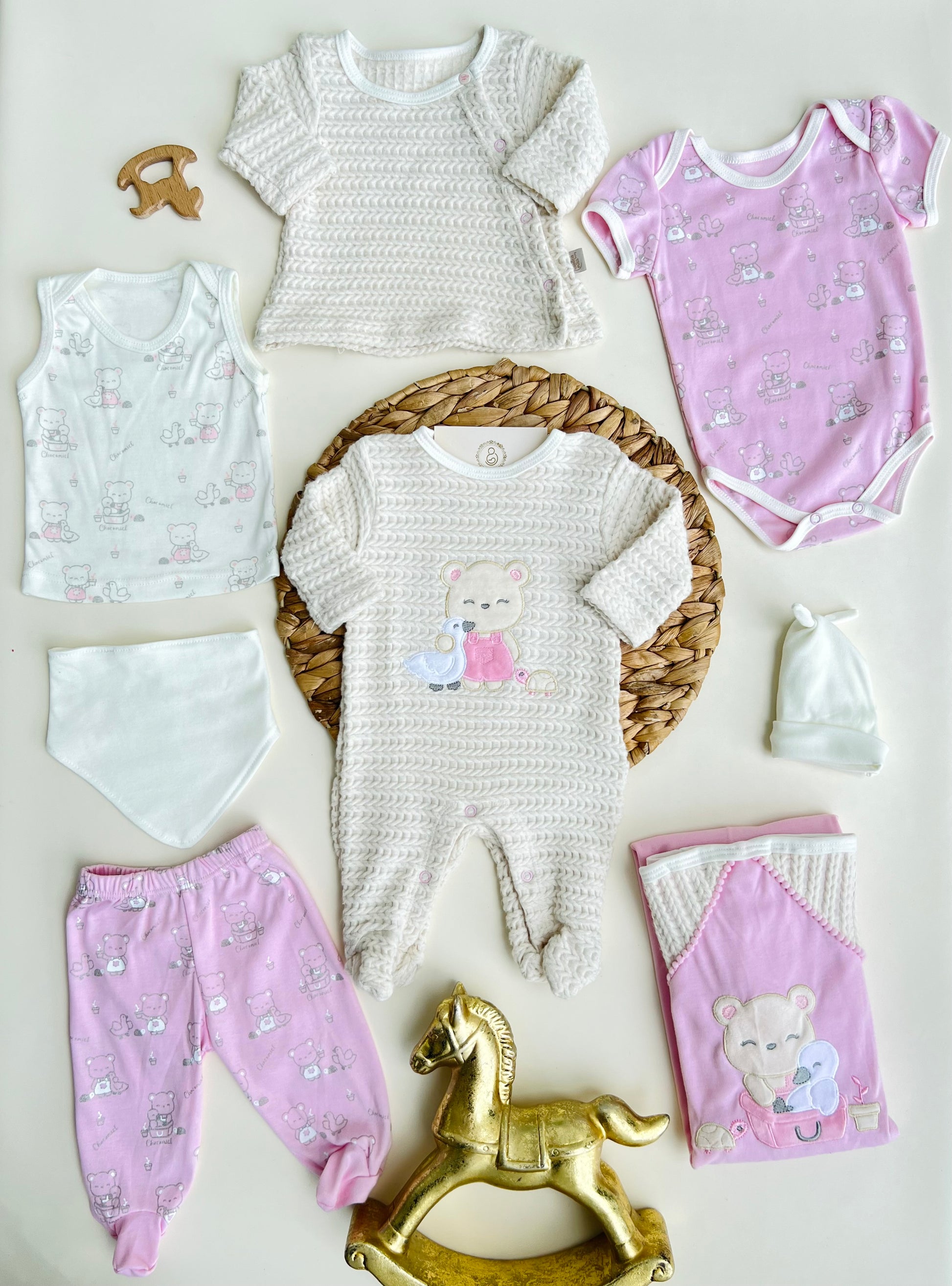 Incluye 8 piezas: enterizo manga larga con pies, body estampado, camiseta sin mangas, pantalón, chaqueta, gorro con pompón, babero bandana, manta y pañuelo, todo elaborado en telas suaves y transpirables que cuidan la piel sensible del bebé.