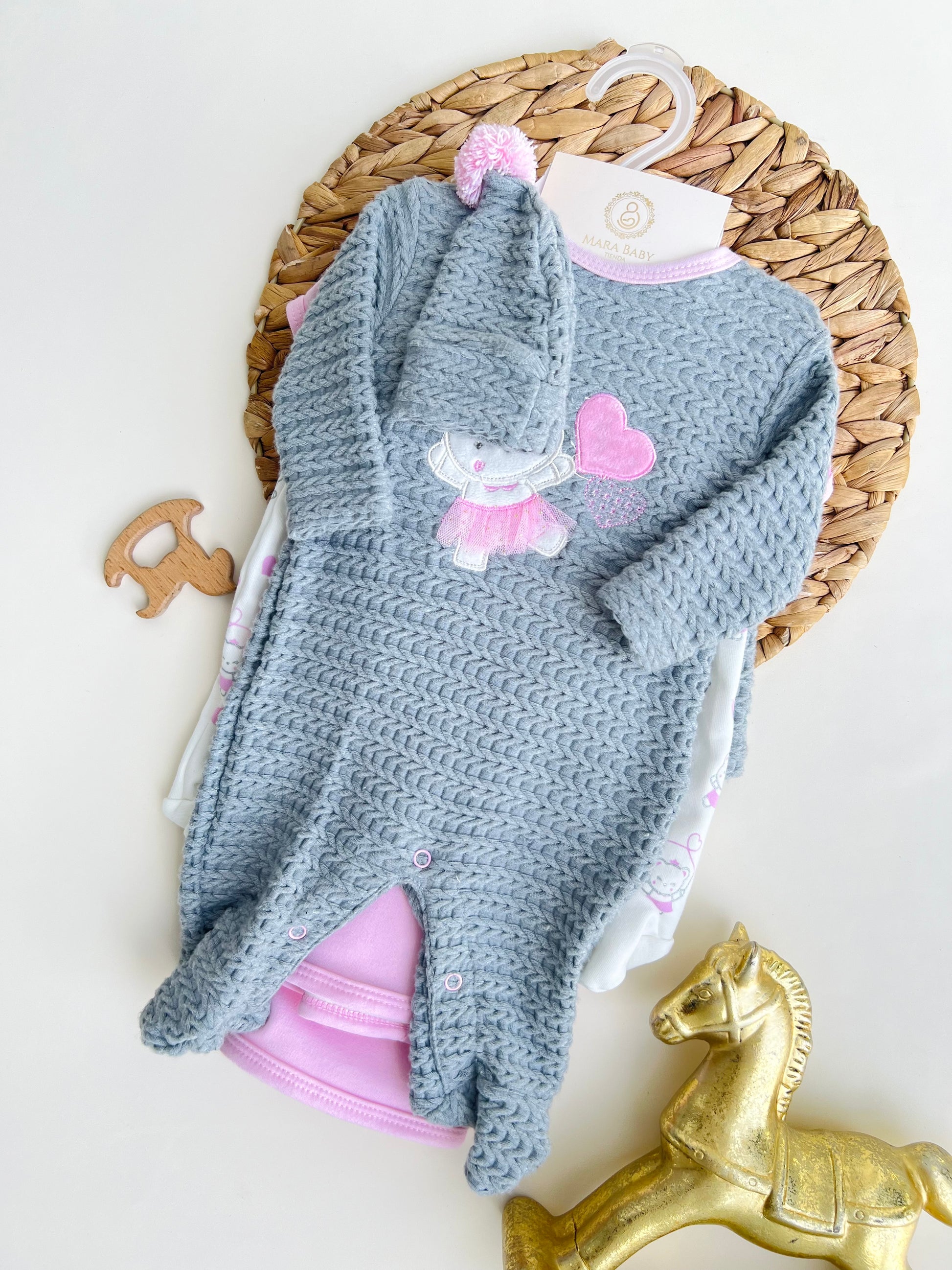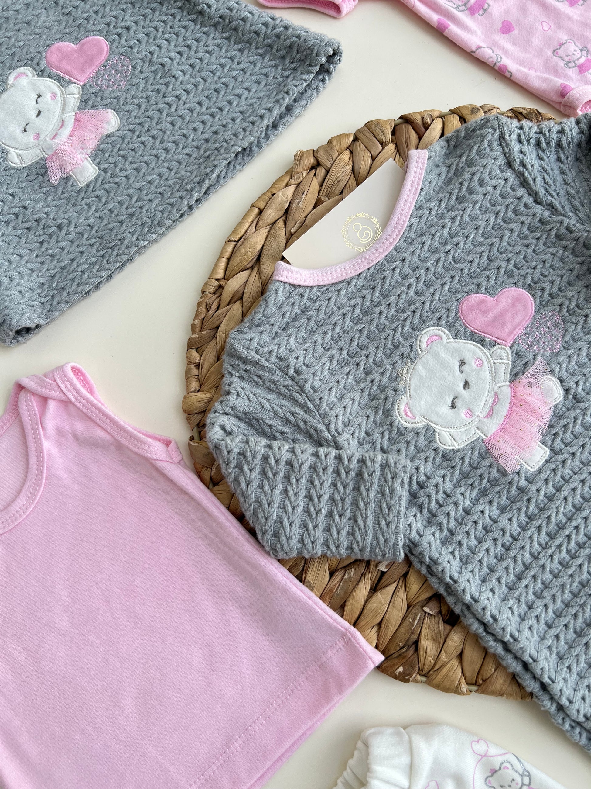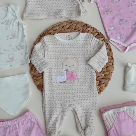 Incluye 8 piezas: enterizo manga larga con pies, body estampado, camiseta sin mangas, pantalón, chaqueta, gorro con pompón, babero bandana, manta y pañuelo, todo elaborado en telas suaves y transpirables que cuidan la piel sensible del bebé.