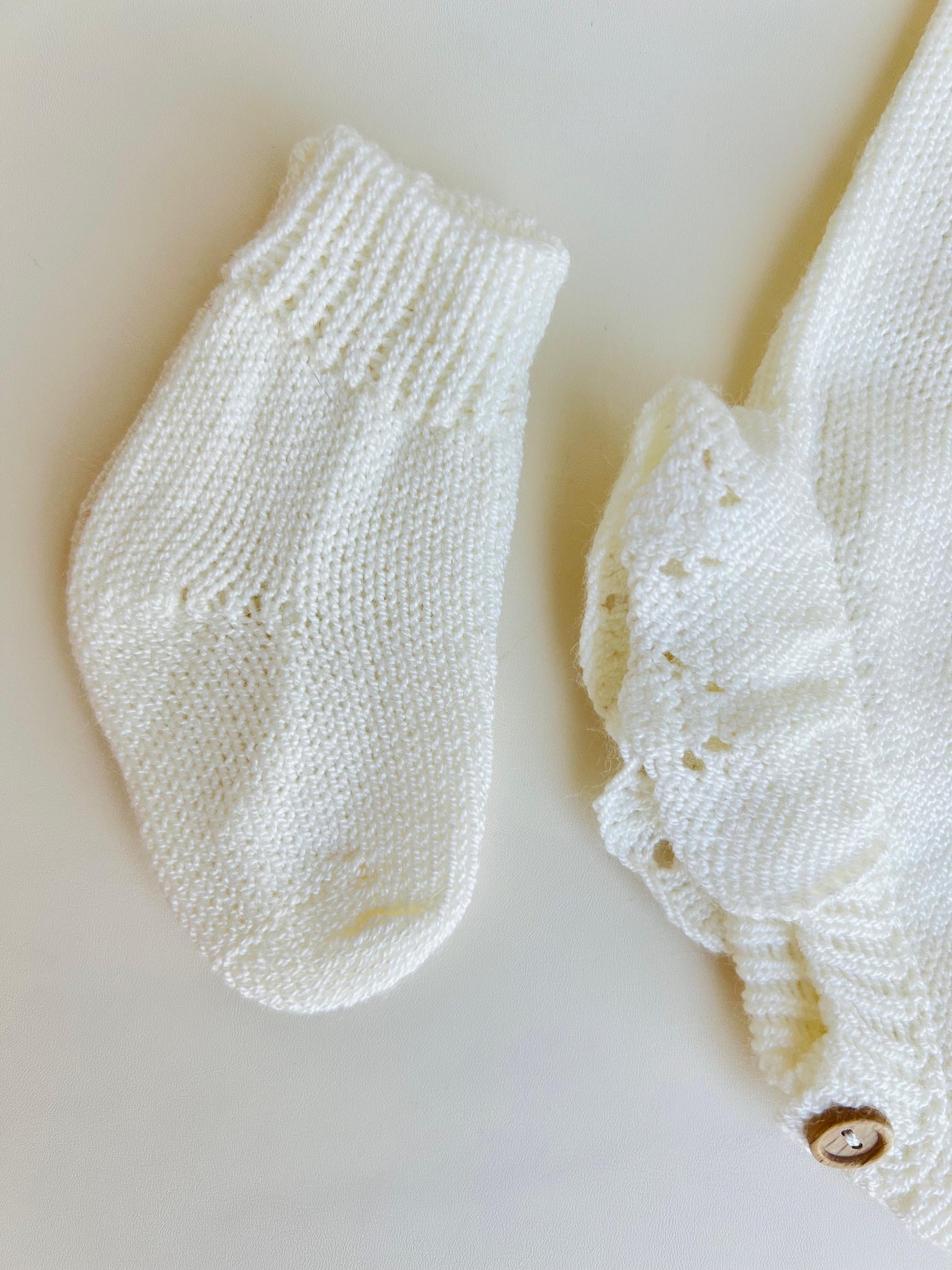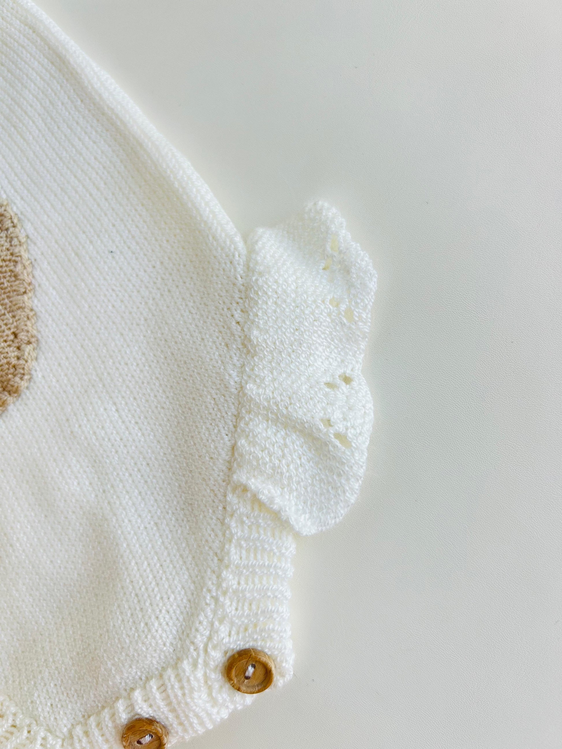 Un conjunto lleno de ternura para celebrar la magia de la Navidad. Este body tejido está elaborado en punto suave y delicado, ideal para mantener a tu bebé cómodo y abrigadito durante la temporada festiva.