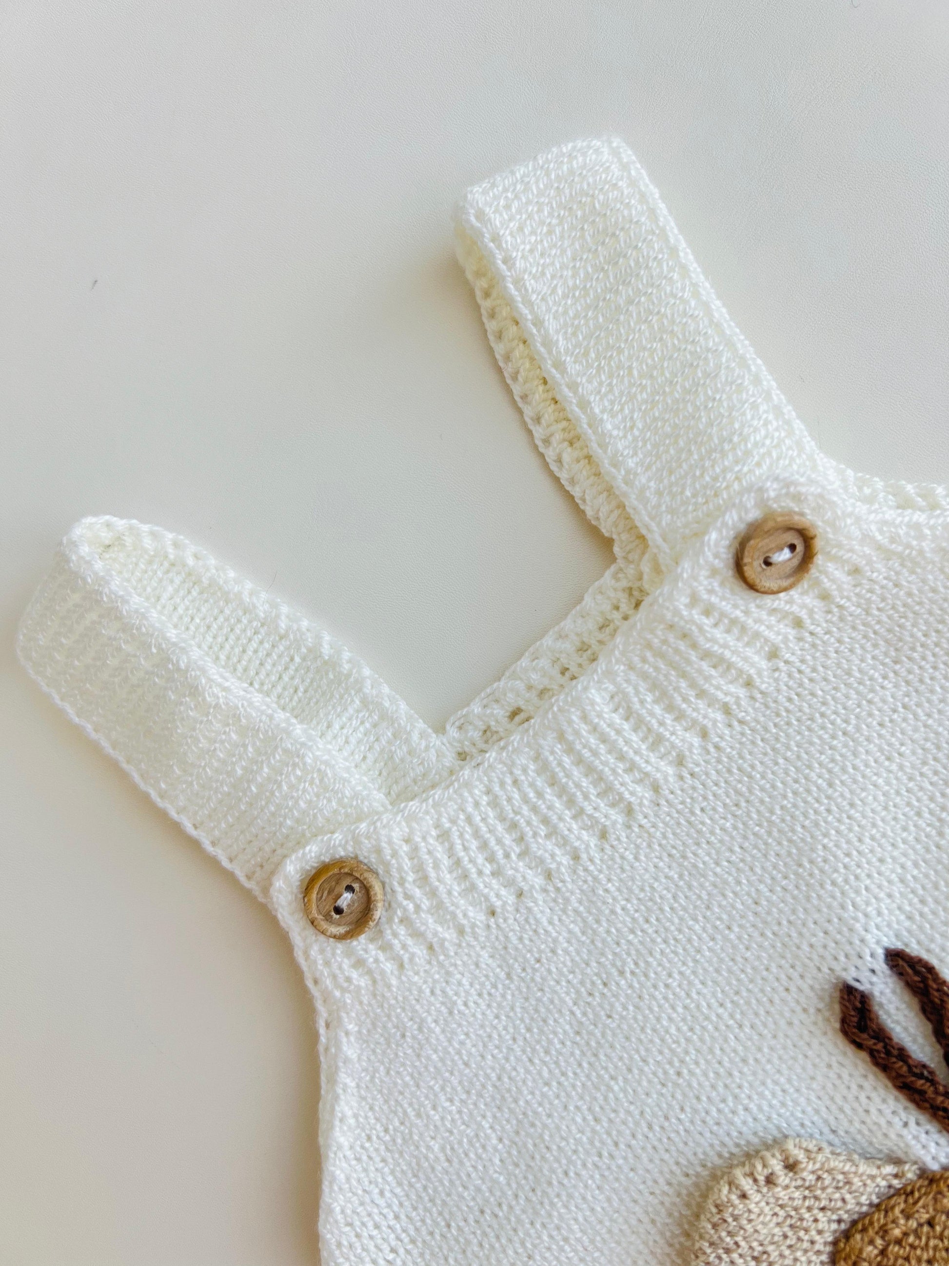 Su diseño destaca por un hermoso aplique tejido de un renito navideño, con detalles en relieve como la naricita tejida, orejitas y cuernitos que le dan un toque adorable y único. Los tirantes ajustan con botones de madera y la parte inferior cuenta con broches para facilitar el cambio de pañal. Incluye una media tejida a juego para completar el look con coherencia y estilo.