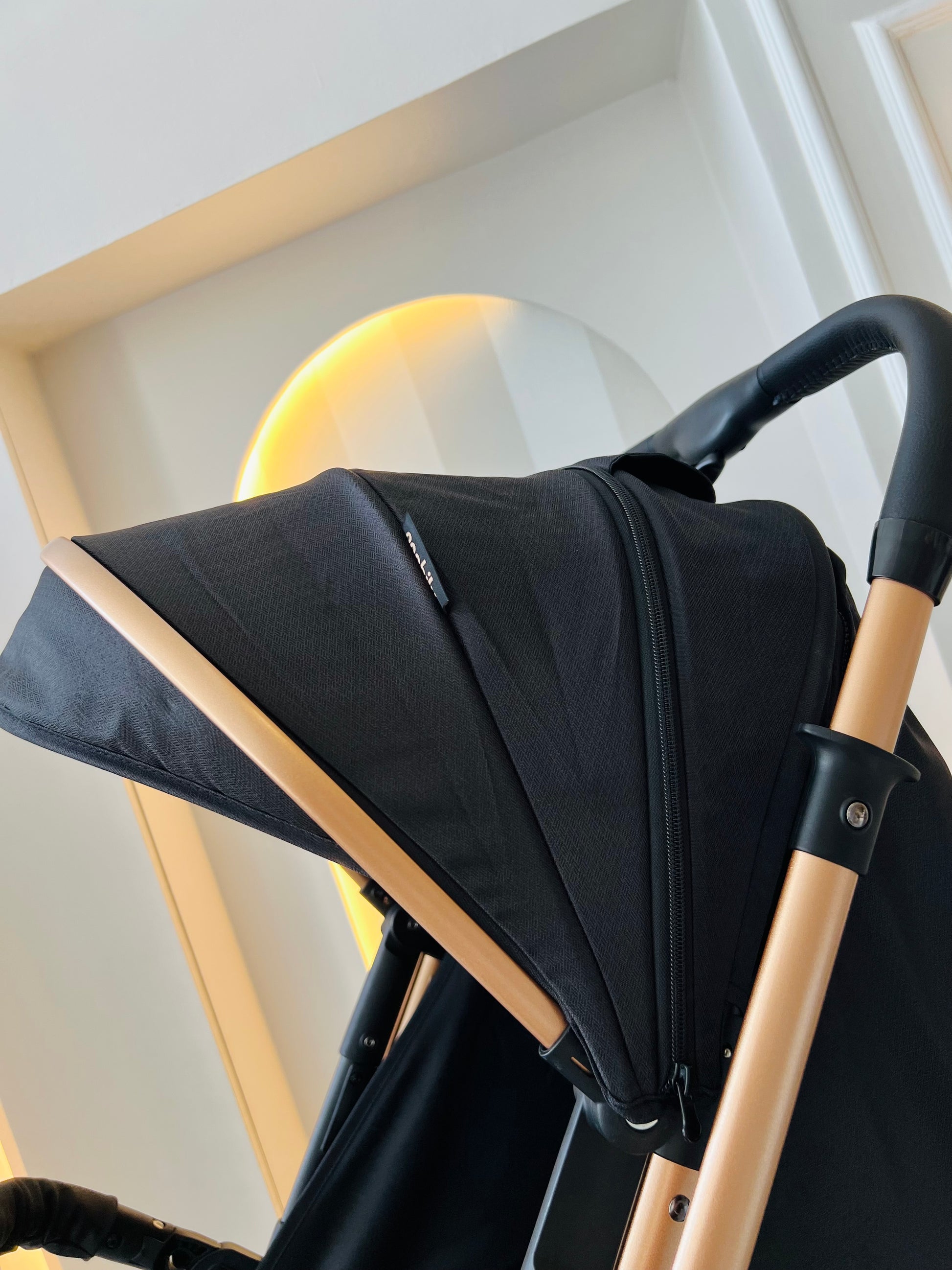 Incorpora capota amplia con extensión y ventilación, arnés de seguridad de 5 puntos, barra frontal acolchada y reposapiés ajustable para mayor confort. Sus ruedas grandes con sistema de suspensión ofrecen un desplazamiento suave y estable, y el freno centralizado garantiza mayor seguridad.