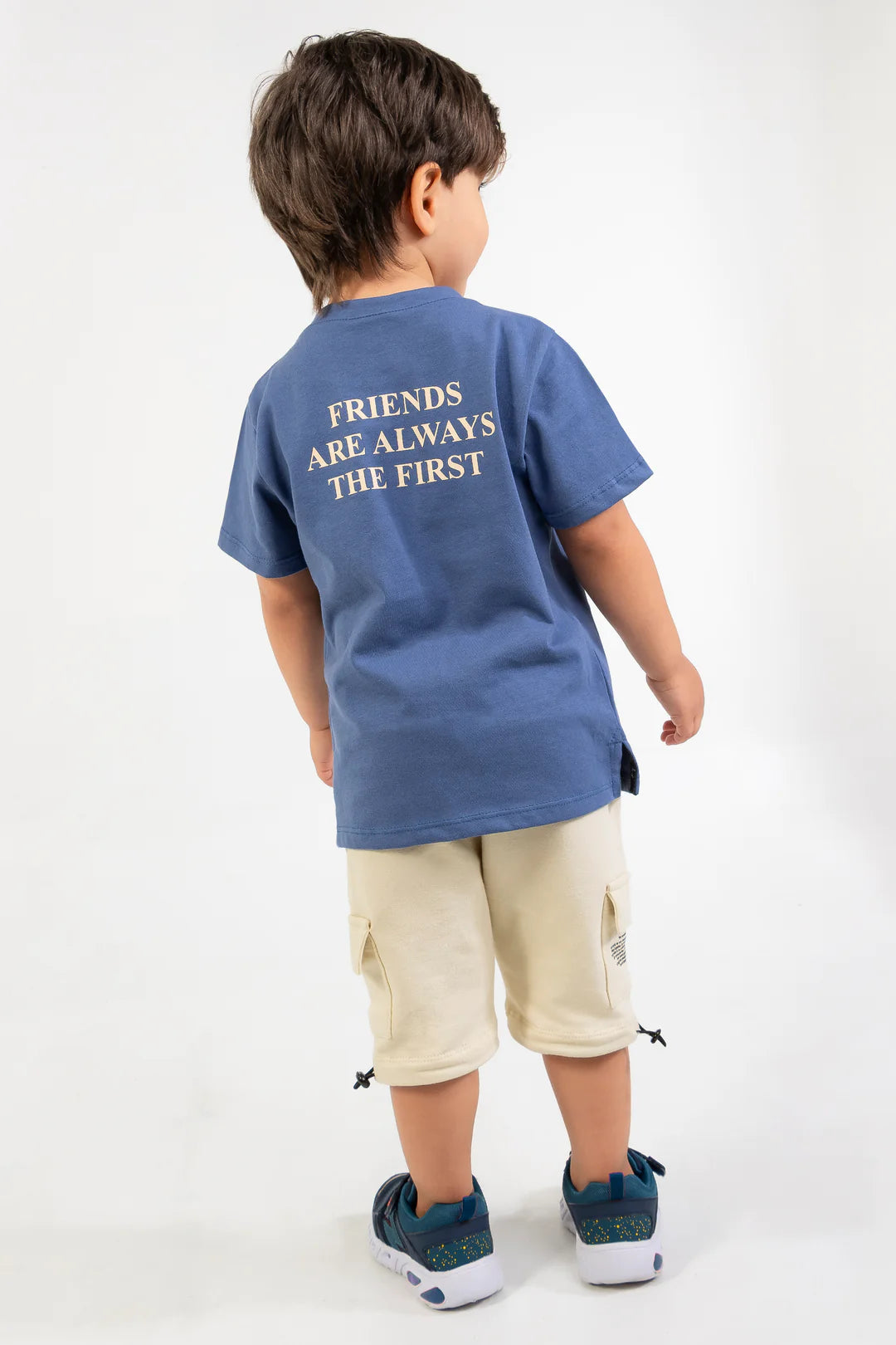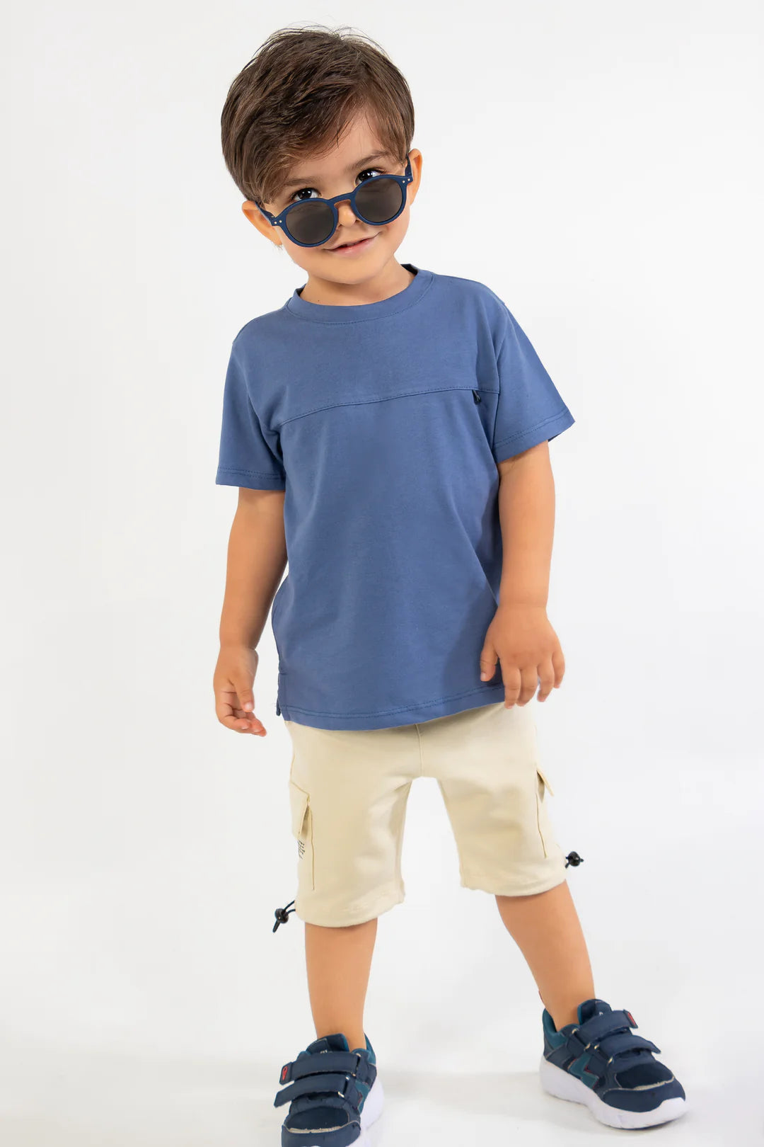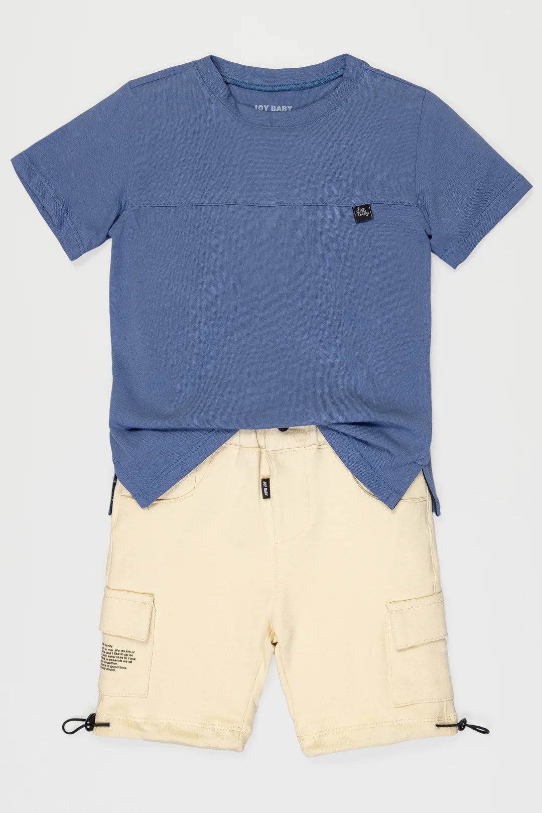 Conjunto cómodo y versátil para niños, compuesto por camiseta de manga corta con costura decorativa frontal y short estilo cargo con bolsillos laterales y jareta ajustable en el bajo. Ideal para jugar, salir o disfrutar de días cálidos con total libertad de movimiento.
