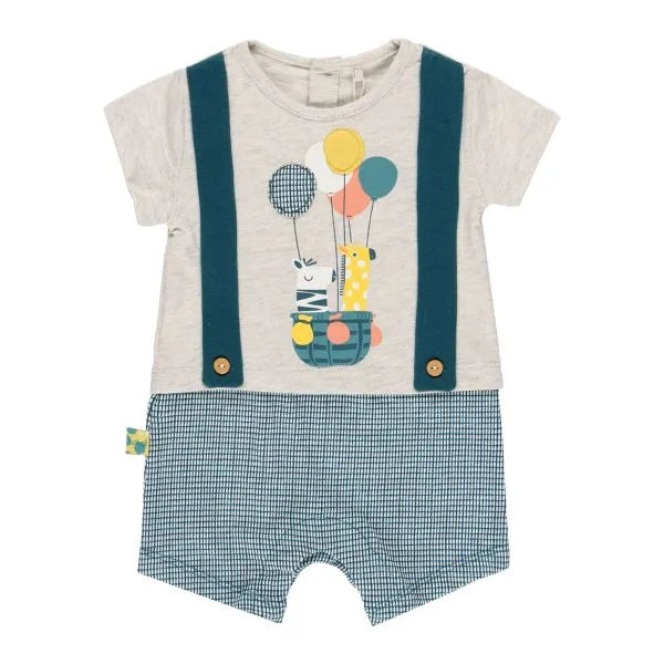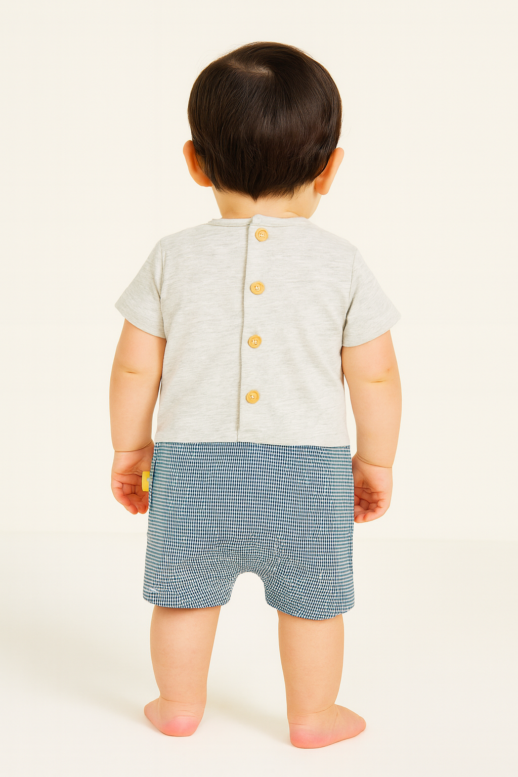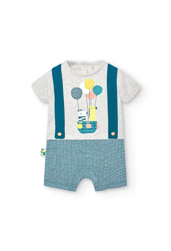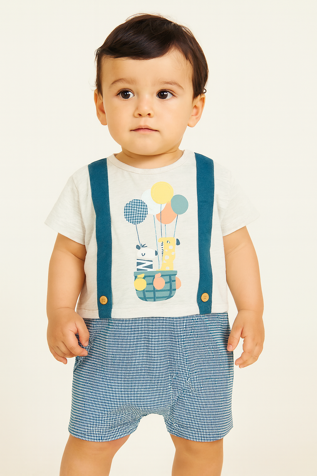 Enterizo estilo conjunto con diseño divertido de tirantes y estampado de globos. La parte superior presenta ilustraciones coloridas y la inferior imita un pantalón de cuadros, creando un look moderno y original. Cuenta con broches inferiores para facilitar el cambio. Ideal para días activos y llenos de imaginación.