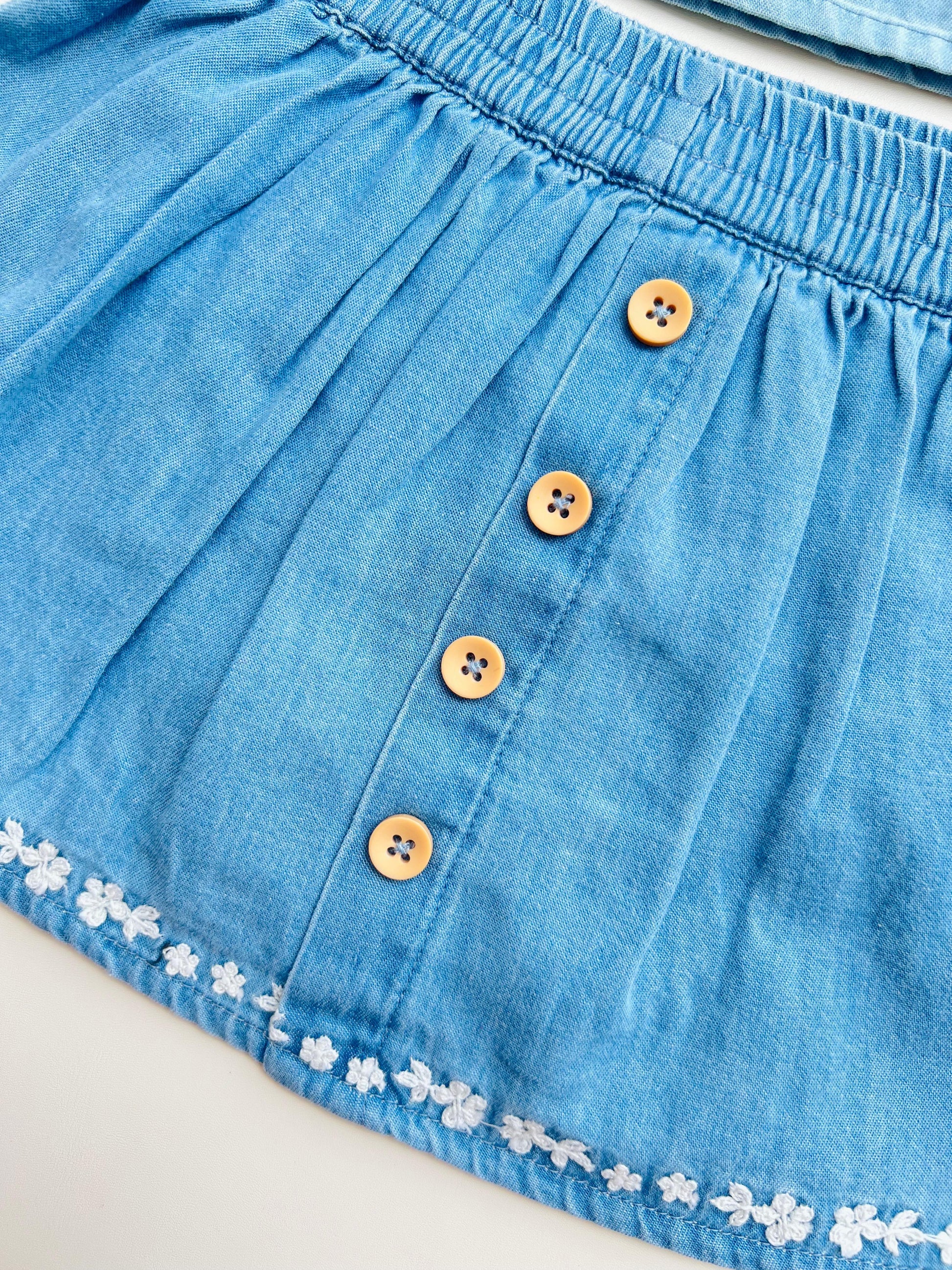 Este conjunto de dos piezas ofrece un estilo fresco y delicado, ideal para el día a día de tu pequeña. Incluye una blusa ligera con mangas amplias y bordados florales, acompañada de una falda a juego con pretina elástica y botones decorativos al frente.