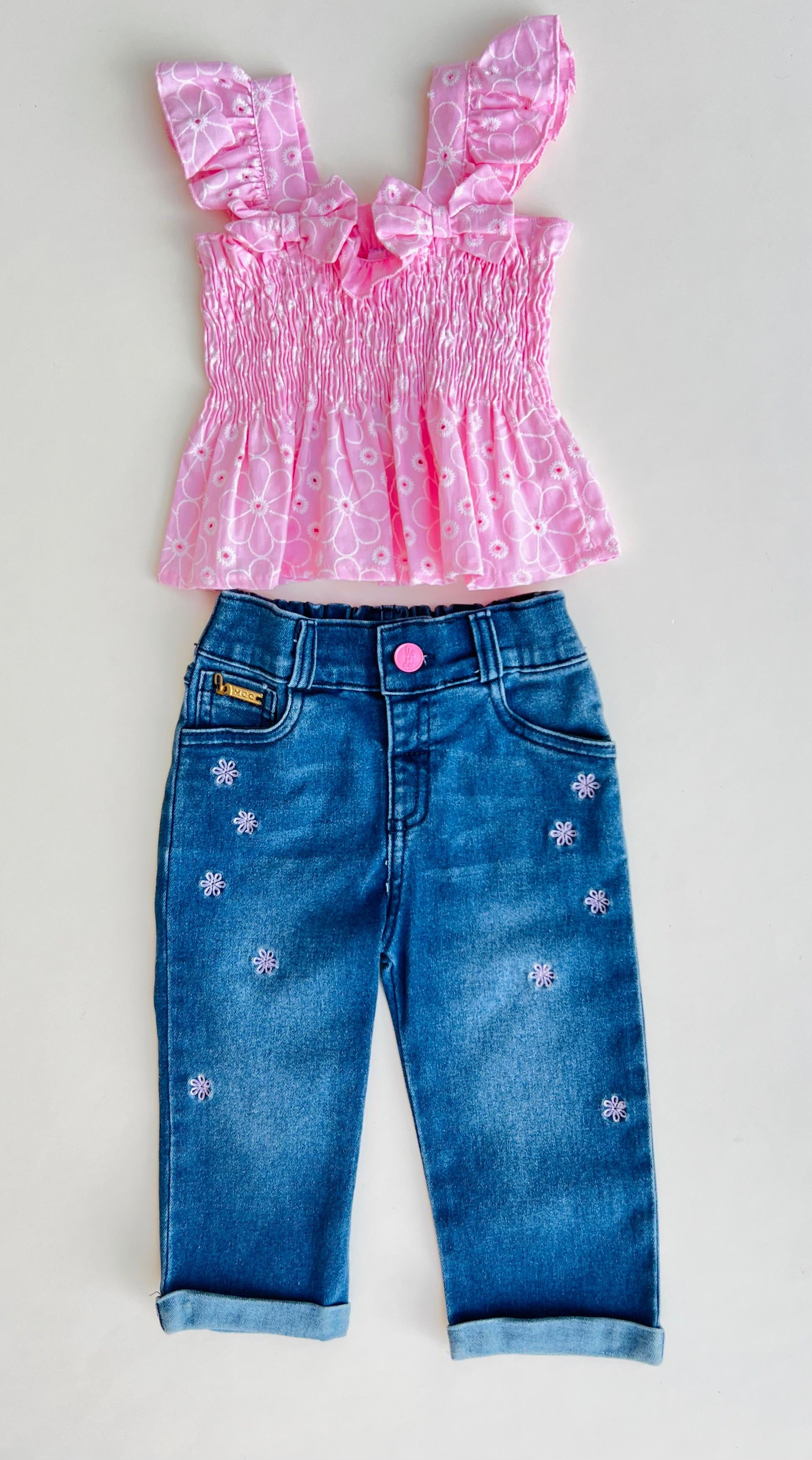 Este encantador conjunto para niña combina una blusa tipo top con nido de abeja y un jean bordado, creando un look fresco, delicado y lleno de estilo.
