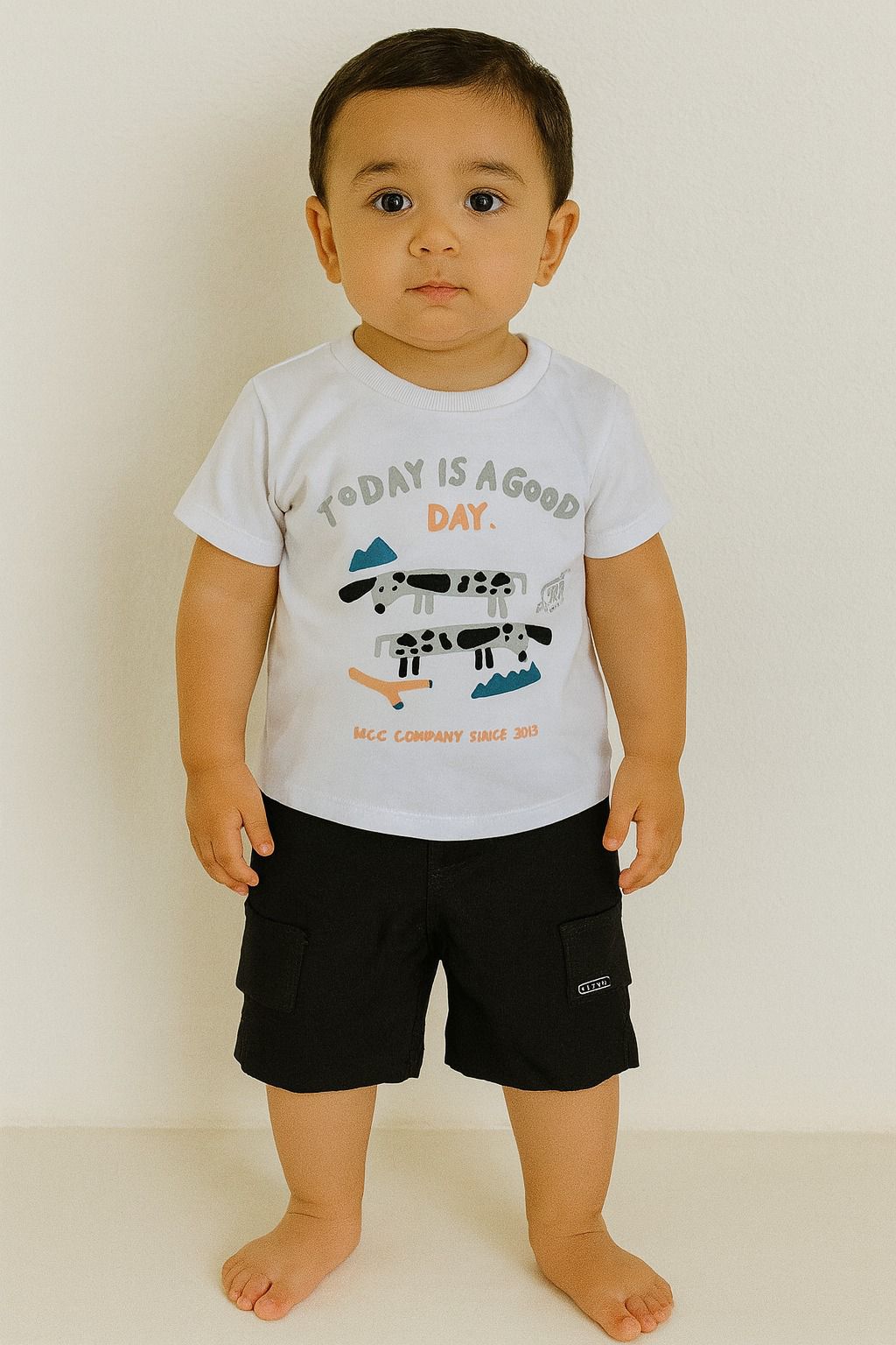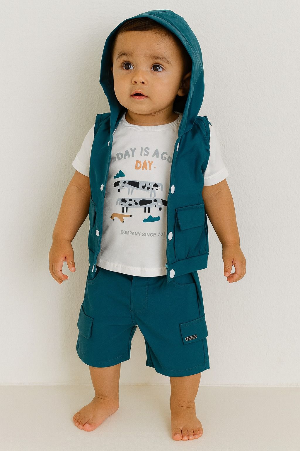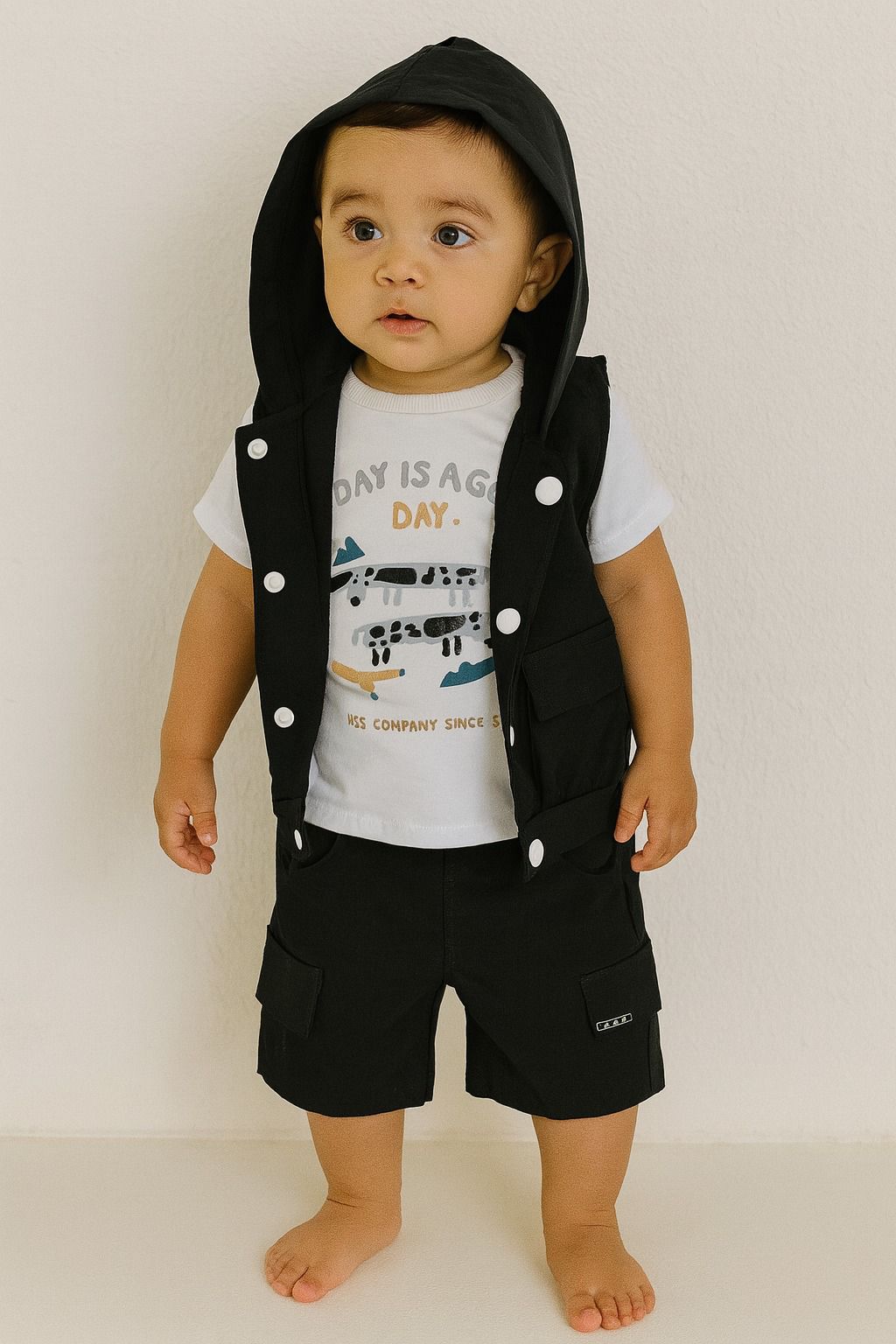 Conjunto infantil de 3 piezas ideal para looks modernos y cómodos. Incluye una camiseta blanca con estampado divertido y colorido de perritos y la frase “Today is a good day”, acompañada de un chaleco sin mangas con capucha y bolsillos tipo cargo que le da un estilo urbano y actual. El short a juego, con bolsillos laterales, completa un outfit práctico y lleno de actitud.