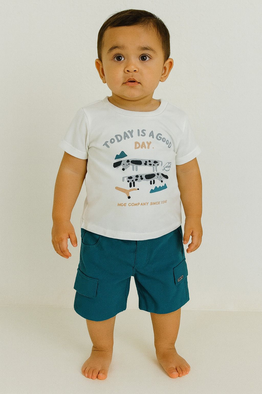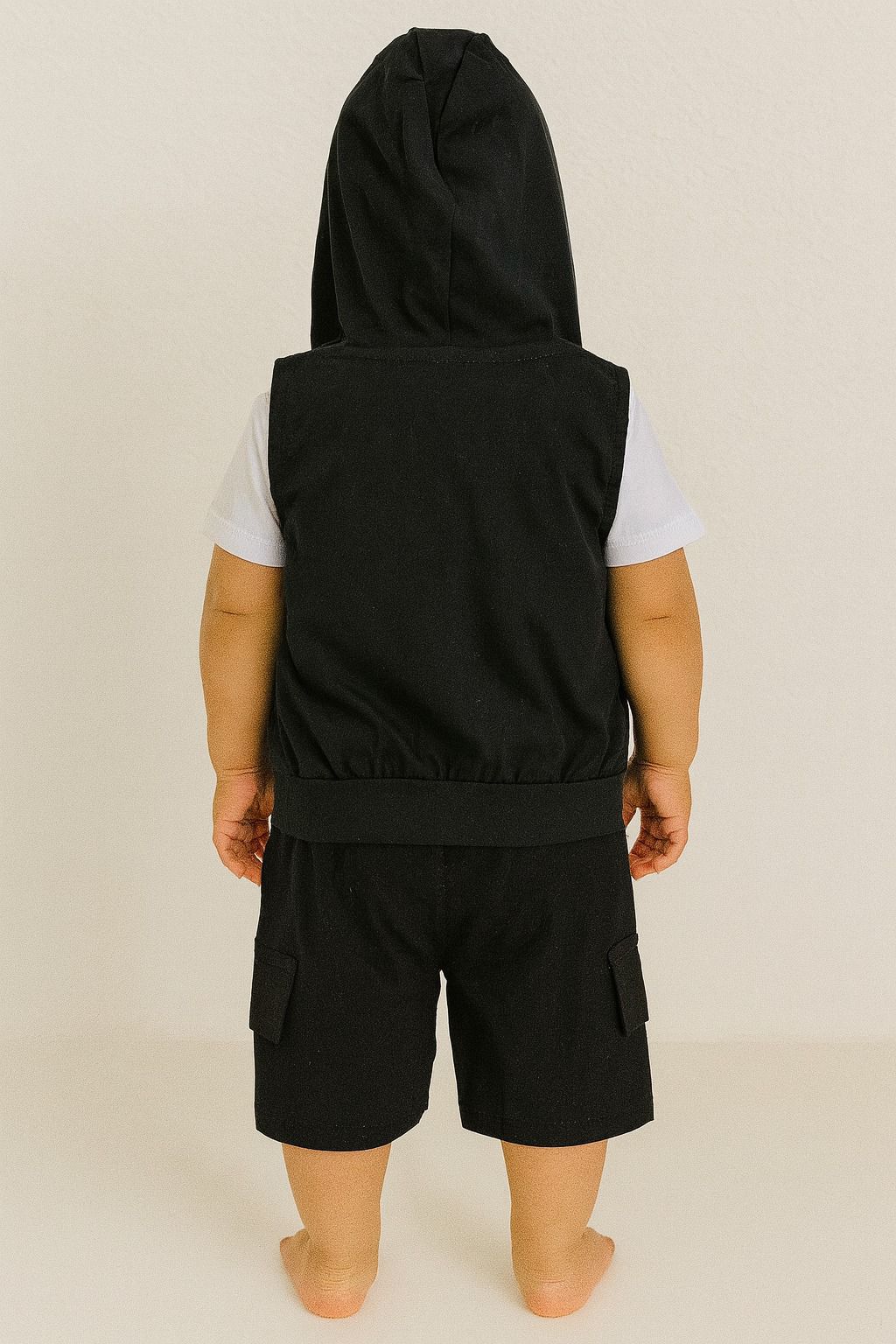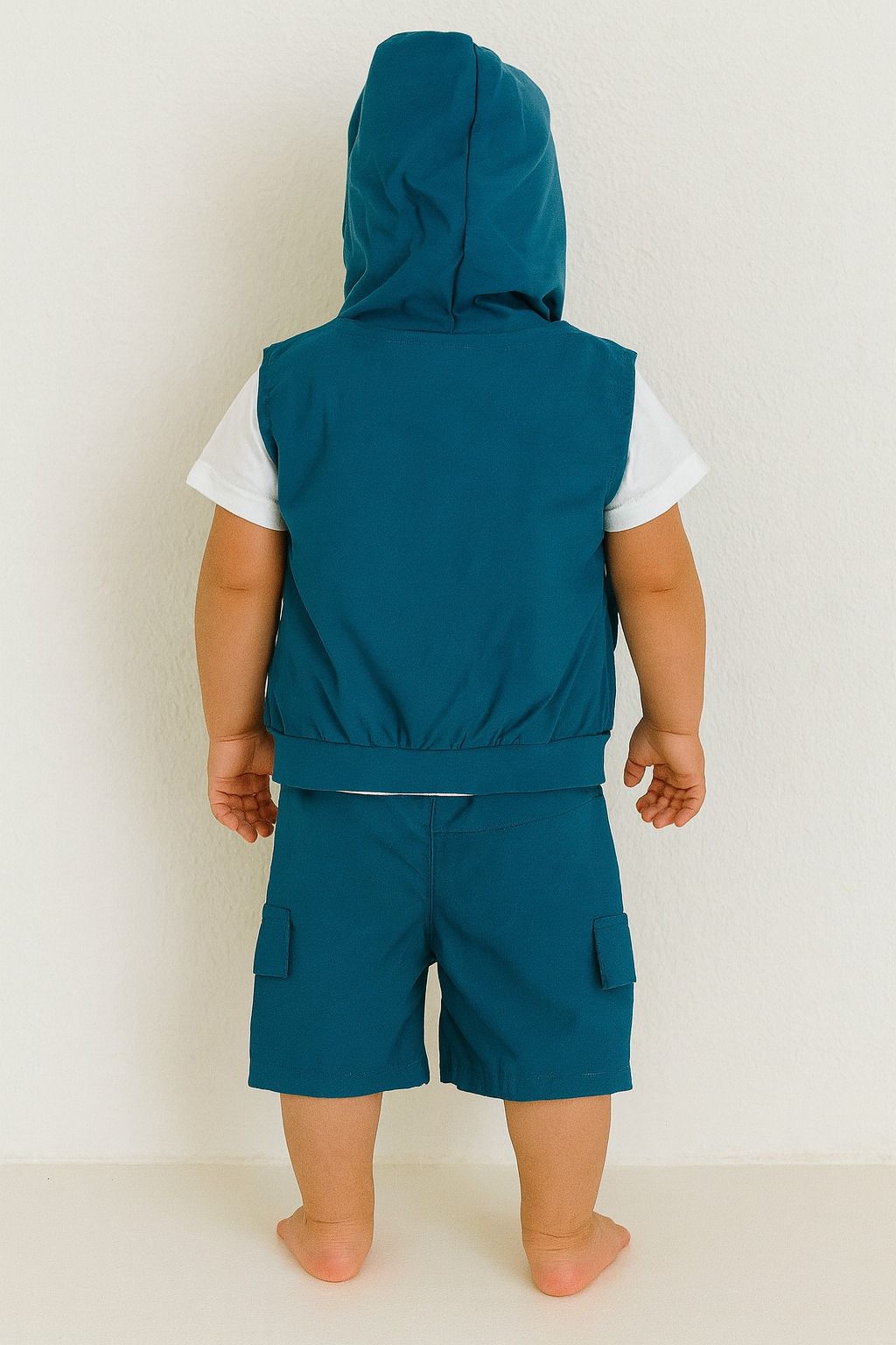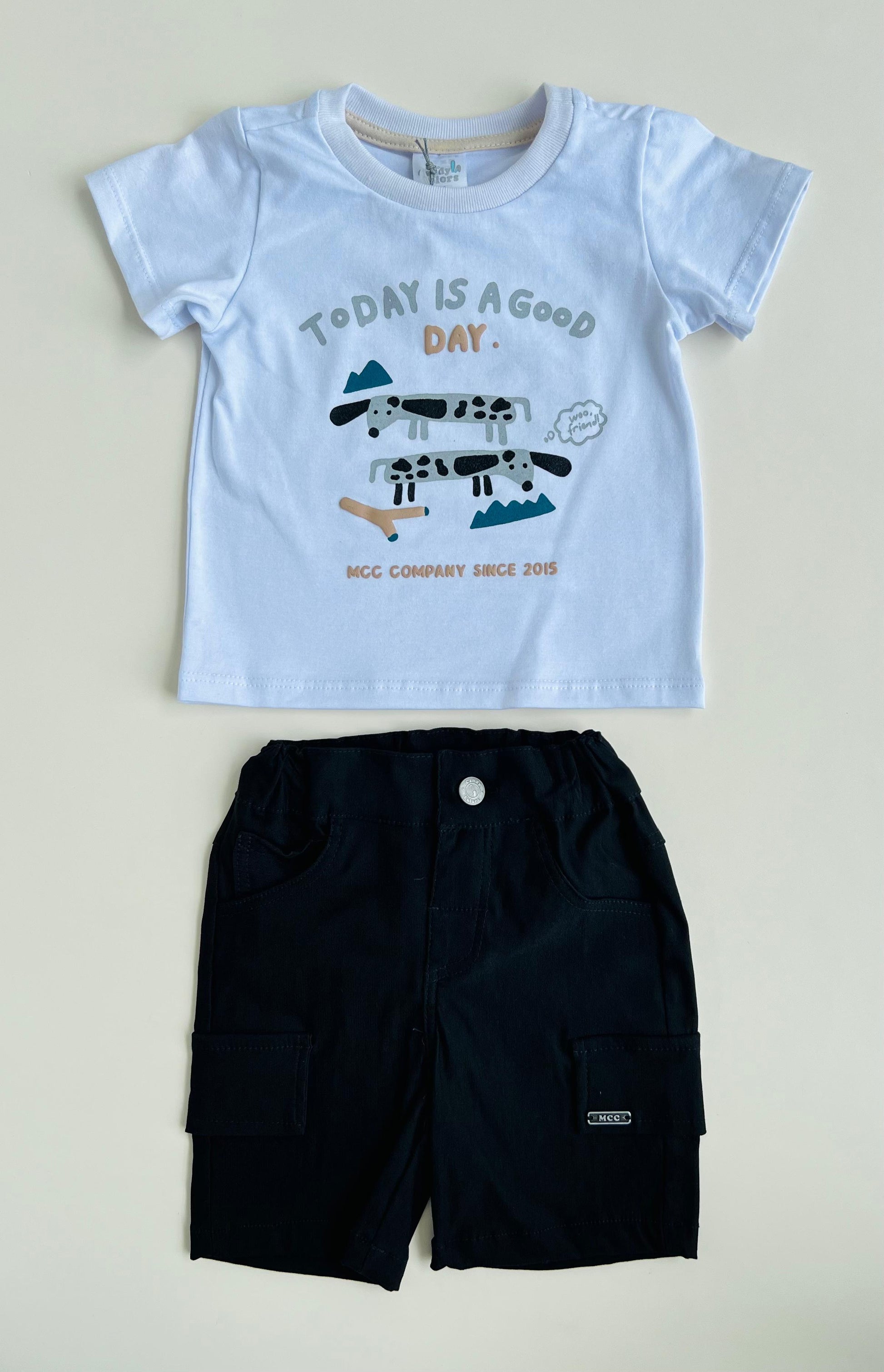 Conjunto infantil de 3 piezas ideal para looks modernos y cómodos. Incluye una camiseta blanca con estampado divertido y colorido de perritos y la frase “Today is a good day”, acompañada de un chaleco sin mangas con capucha y bolsillos tipo cargo que le da un estilo urbano y actual. El short a juego, con bolsillos laterales, completa un outfit práctico y lleno de actitud.