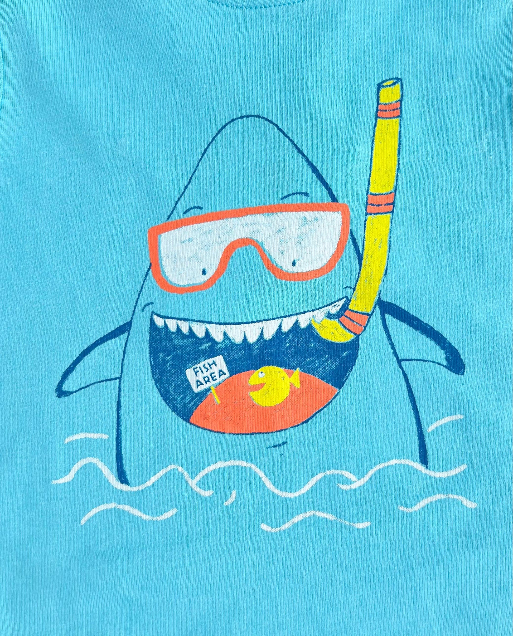 • Estampado frontal de tiburón buceador con snorkel, ideal para los pequeños aventureros.