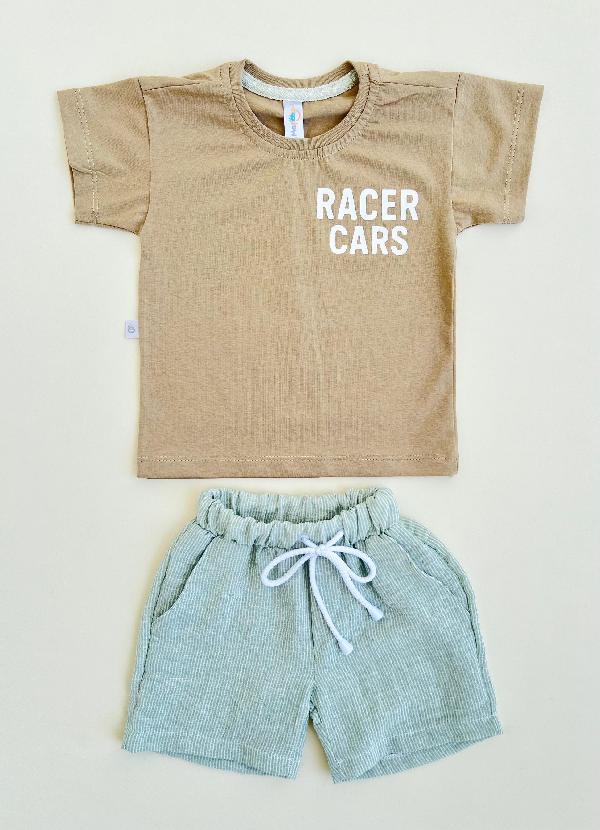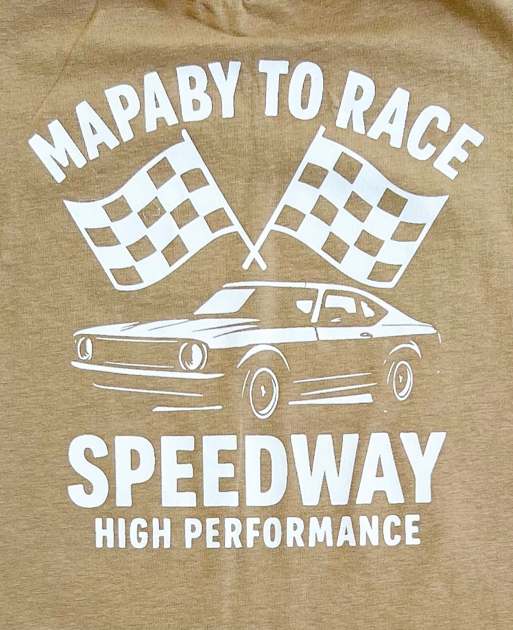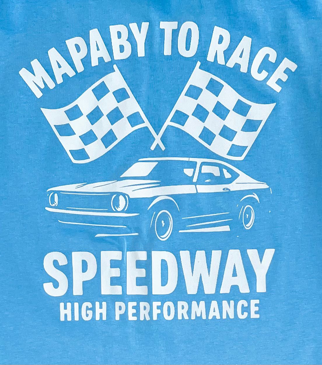 - Diseño delantero con el print “Racer Cars” y estampado trasero con banderas de carrera y carro deportivo.