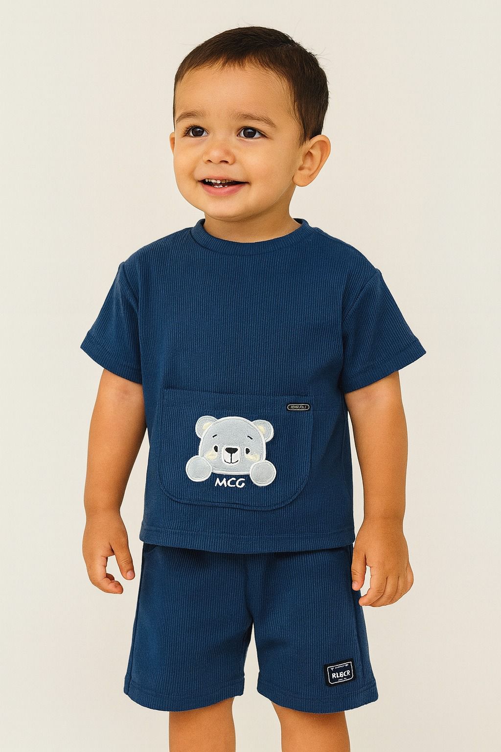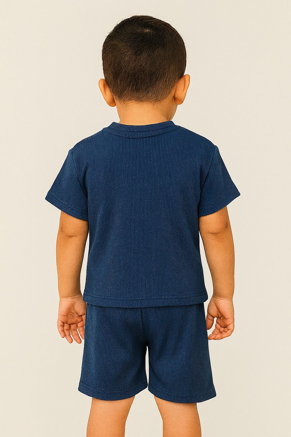 El short a juego, en el mismo tono azul marino, cuenta con pretina elástica que brinda comodidad y libertad de movimiento, ideal para los pequeños más activos.
