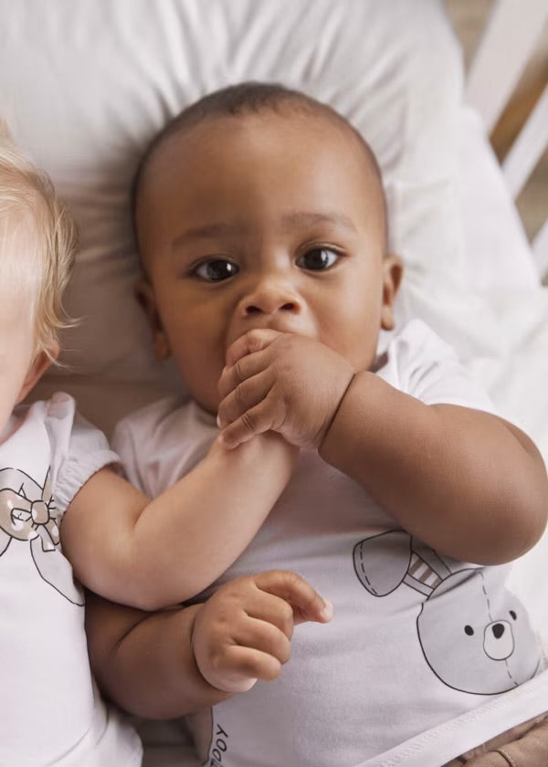 Camiseta de manga corta para recién nacido. Cuello redondo. Botón a presión en el cuello para facilitar la puesta de la prenda. Suave tejido de algodón elástico. Elementos de adorno: detalles de canalé, serigrafía (print).