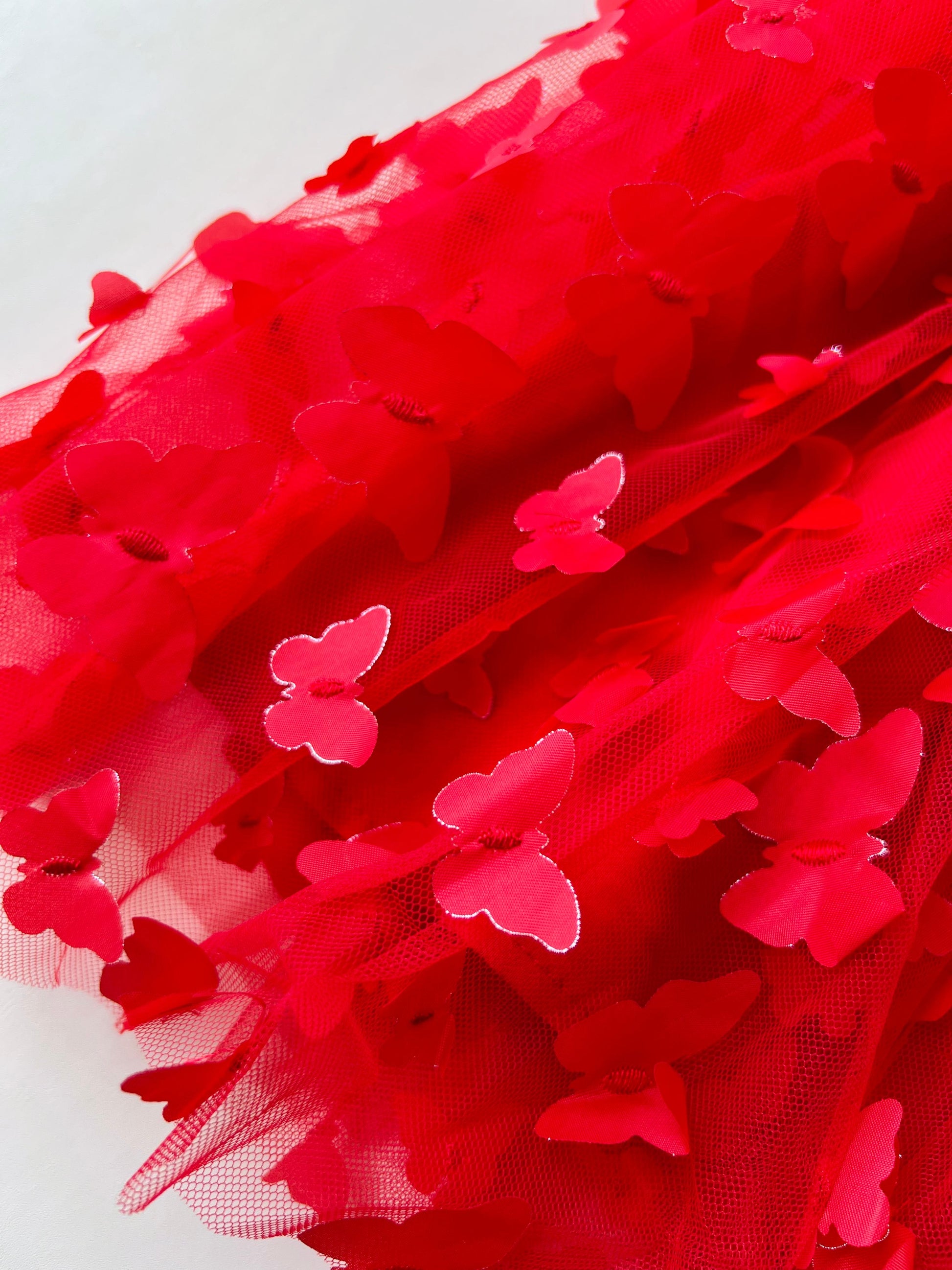 Un diseño encantador y lleno de movimiento, ideal para ocasiones especiales, celebraciones o sesiones de fotos. Este vestido destaca por su confección en tul rojo suave, decorado con mariposas tridimensionales que aportan textura, volumen y un efecto visual único en cada paso.