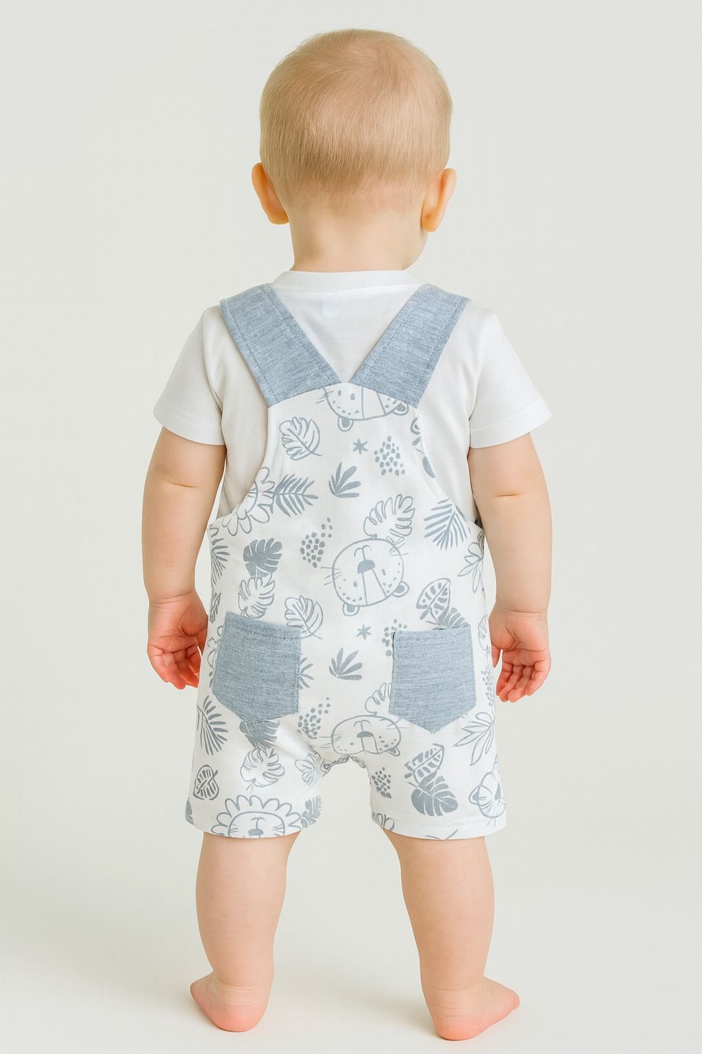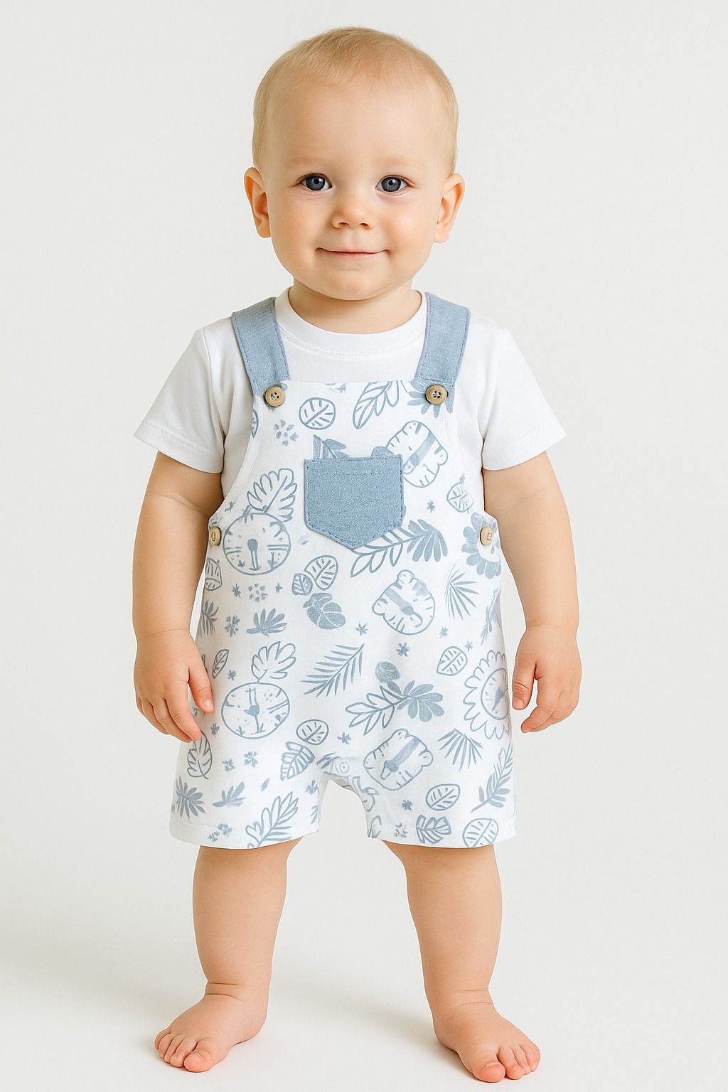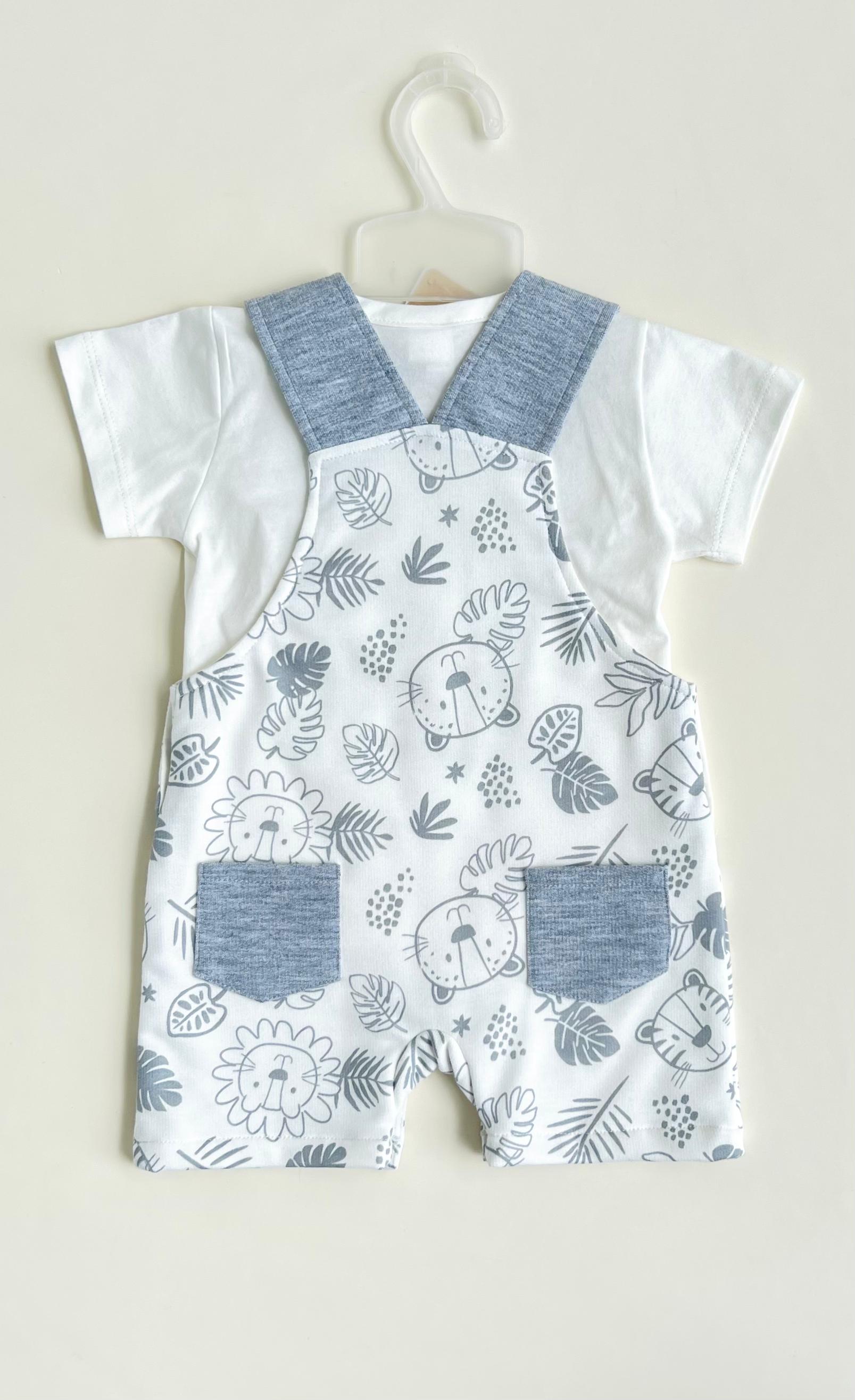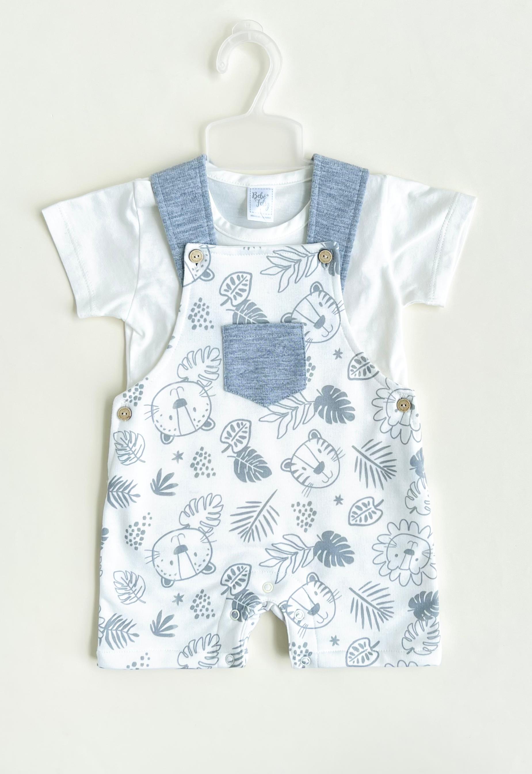 Un look fresco, tierno y lleno de encanto para tu bebé. Este conjunto combina una jardinera estampada con leones y motivos selváticos junto a una camiseta blanca básica, creando un estilo adorable y muy cómodo.