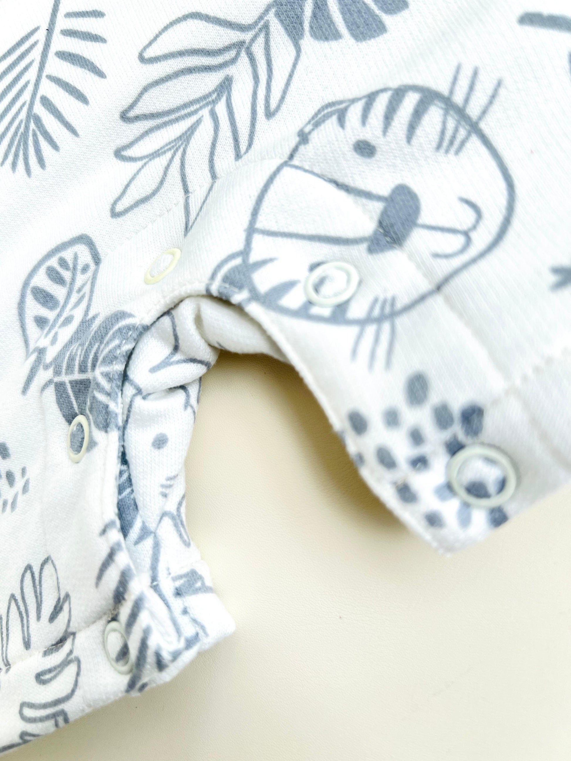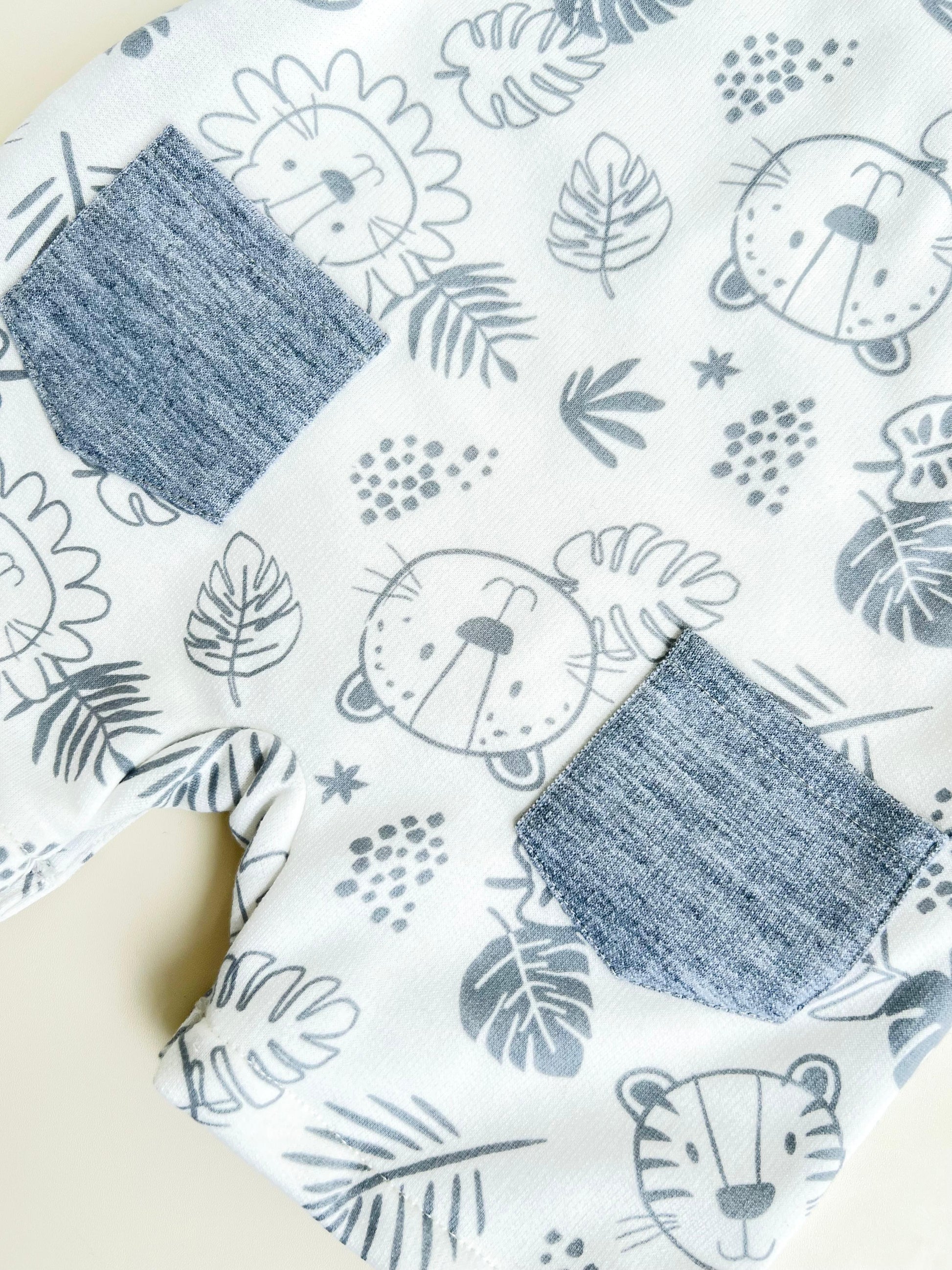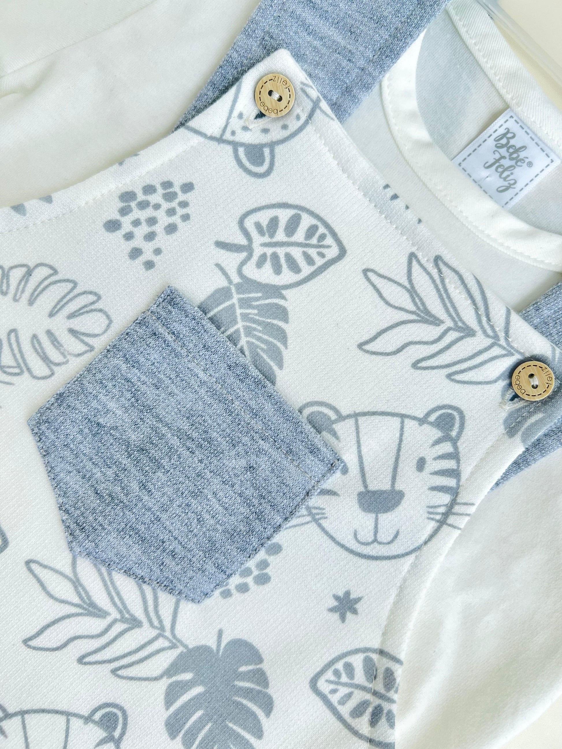 - Jardinera corta en tonos azul grisáceo, con estampados de leones y hojas, ideal para dar un aire natural y divertido.
