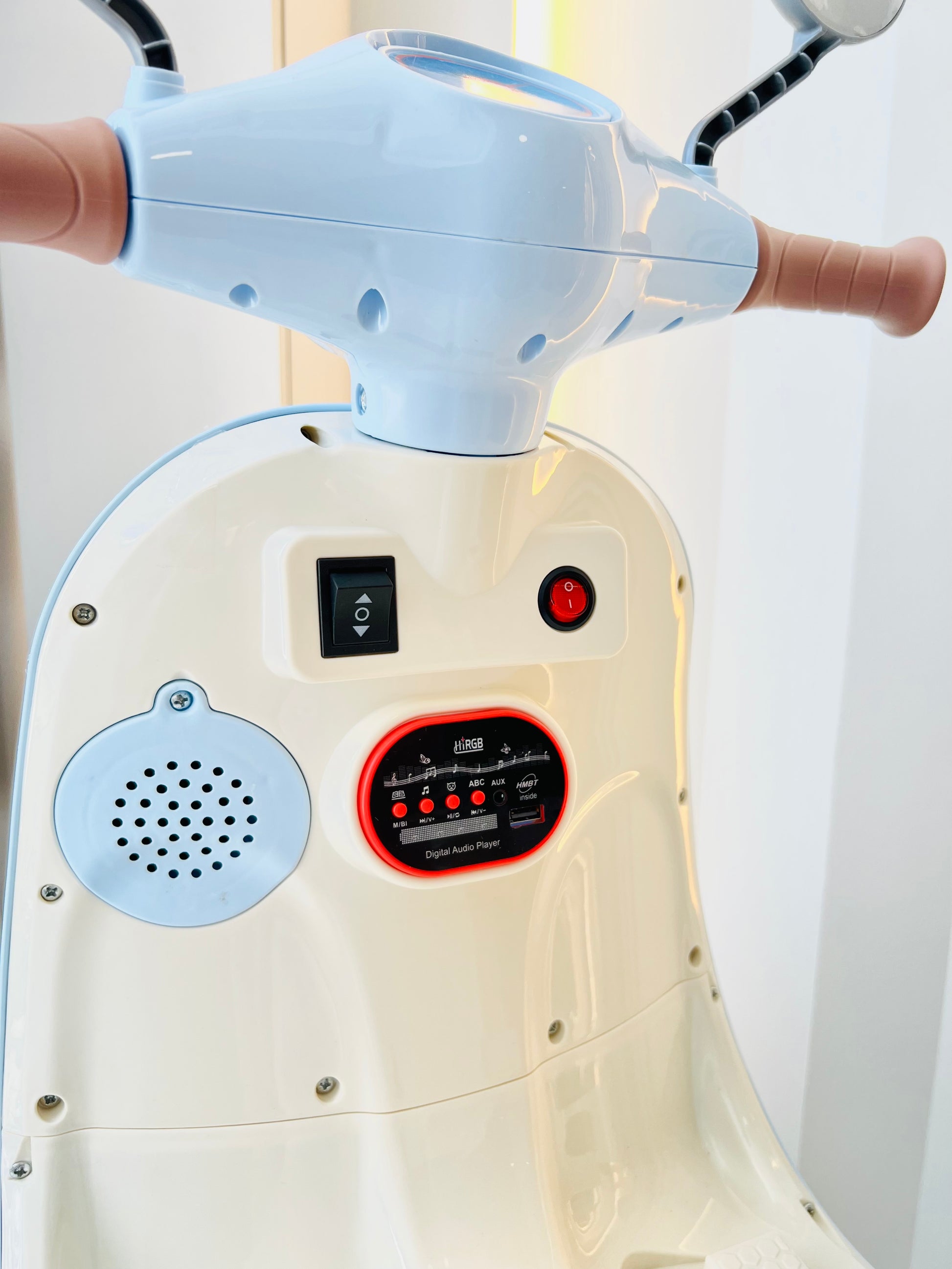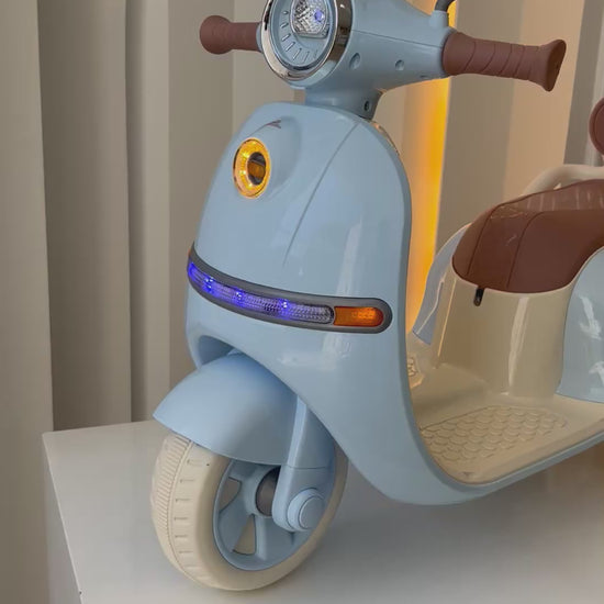 Diversión, estilo y movimiento en una sola moto. Inspirada en el diseño clásico de las scooters europeas, esta moto eléctrica combina un look moderno con funciones que encantarán a los más pequeños.