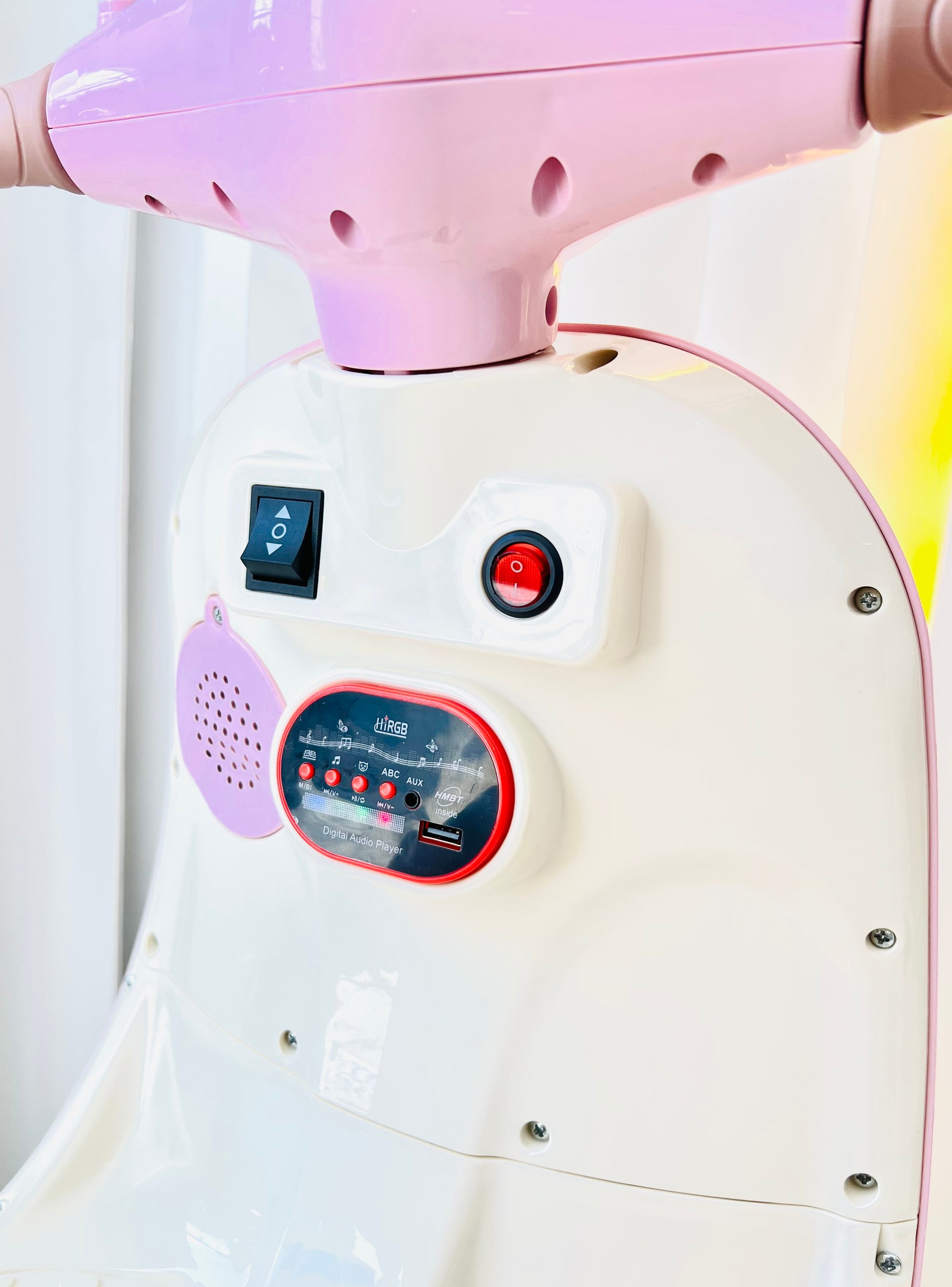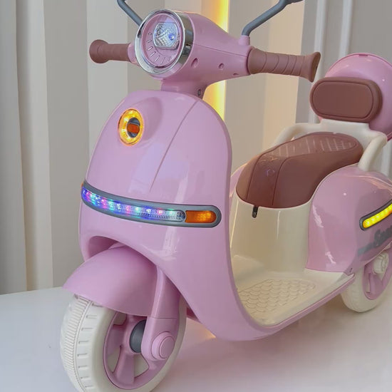 Diversión, estilo y movimiento en una sola moto. Inspirada en el diseño clásico de las scooters europeas, esta moto eléctrica combina un look moderno con funciones que encantarán a los más pequeños.