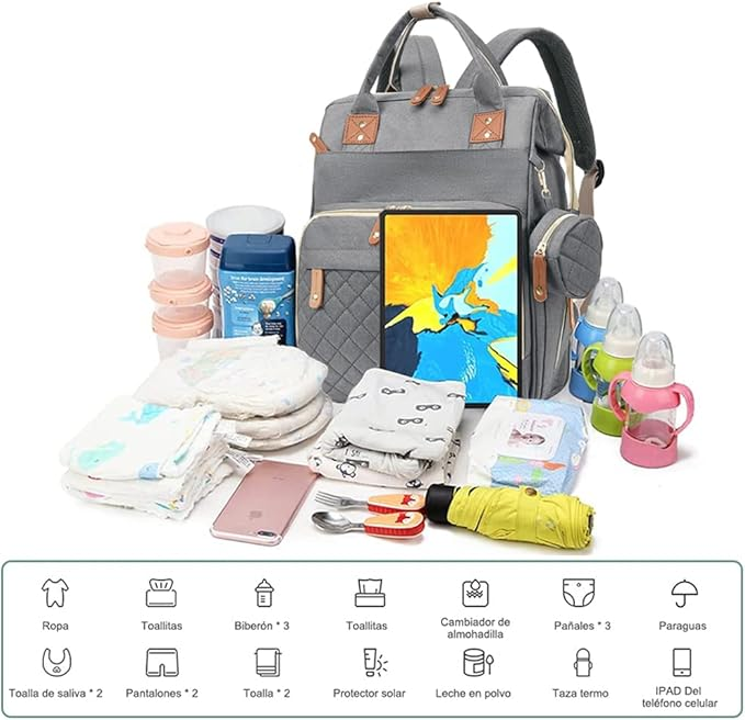- La Pañalera Morral de Bebesitos ofrece un diseño ergonómico y elegante perfecto para colgar. Cuenta con una gran capacidad interna para guardar todos los accesorios y necesidades diarias de tu bebé, cómo las latas de leche en polvo, ropa, talco, toallas, zapatos y más.