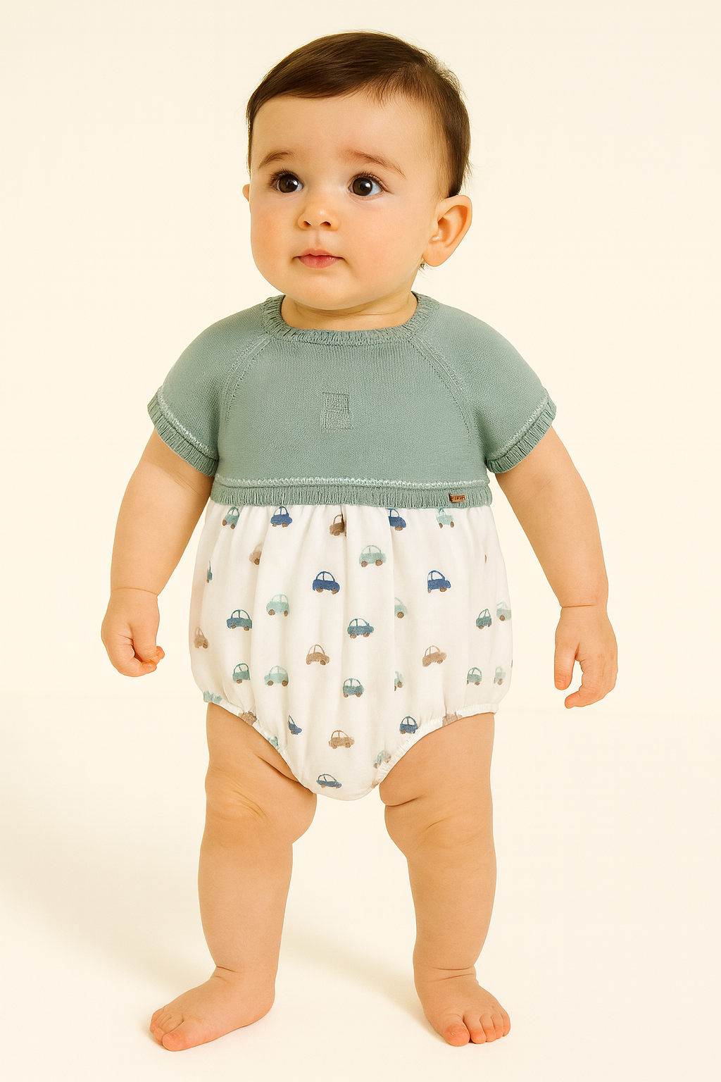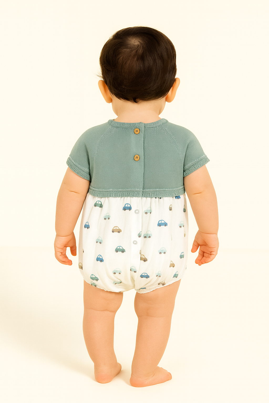 Pelele de manga corta para recién nacido. Cuello redondo. Botones a presión en la entrepierna para facilitar la puesta de la prenda. Cierre con botones en la espalda para facilitar la puesta de la prenda. Tejido de punto tricotosa de tacto suave y agradable. Estampado con motivos del mundo del motor.