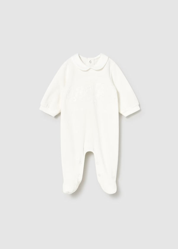 Pijama de manga larga para recién nacido. Cuello bebé. Cierre con botones a presión en la parte posterior. Botones a presión en la entrepierna para facilitar la puesta de la prenda. Elementos de adorno: aplique floral, bordado. En este modelo las tallas mayores (de 6-9 a 18 meses) no llevan pies, para facilitar una mejor movilidad del bebé y mayor confort en el uso.