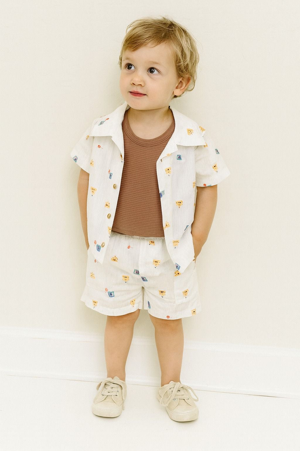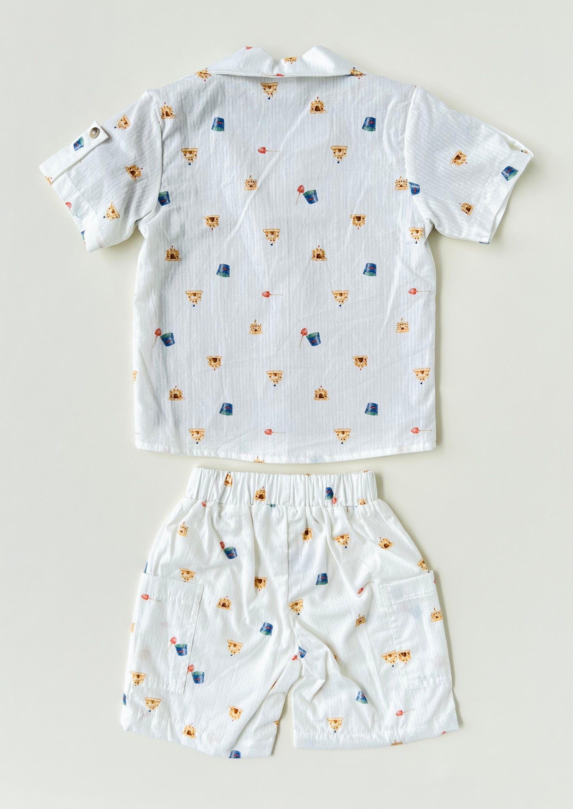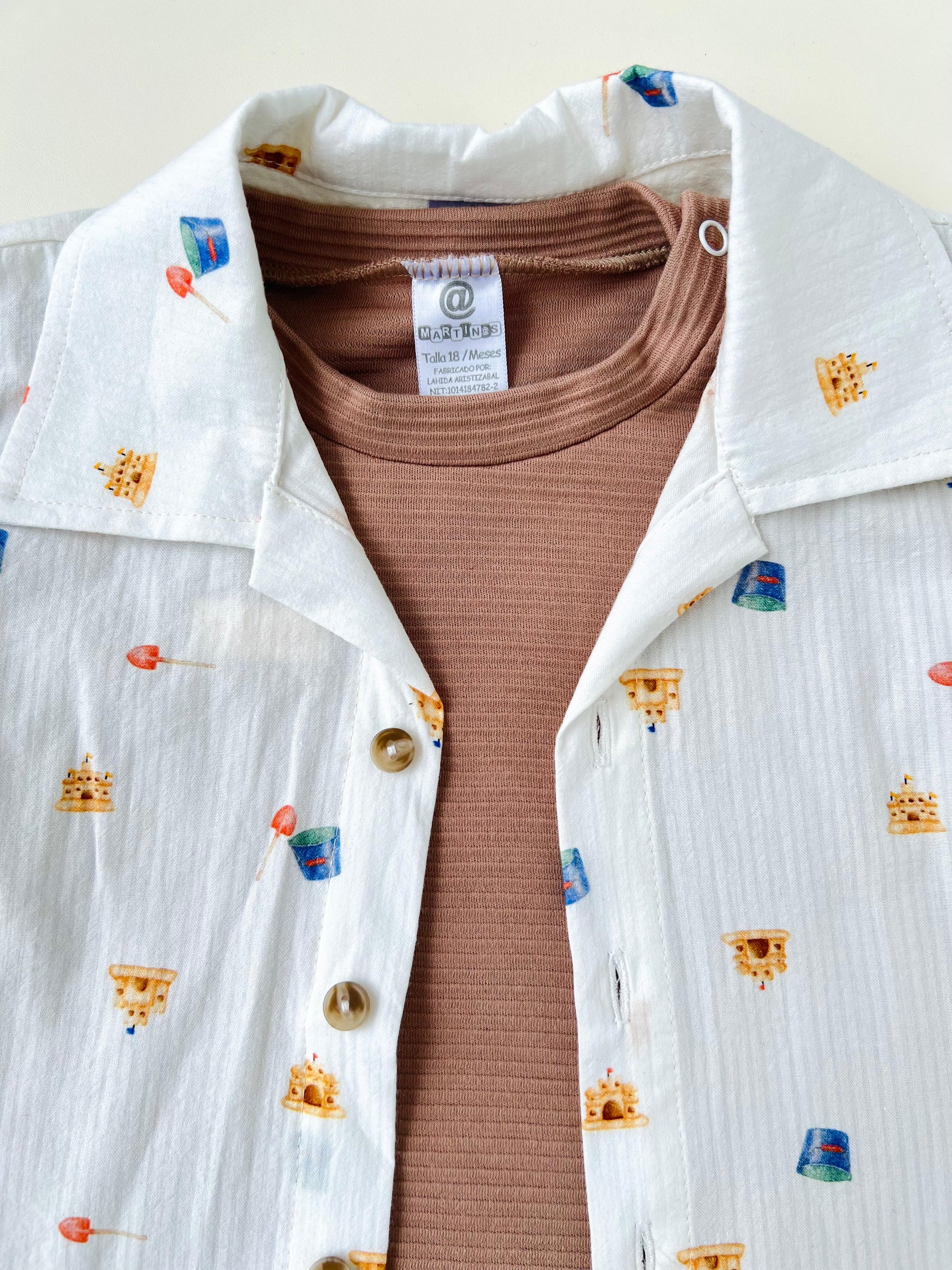 - Camisa manga corta en color blanco con estampados alegres de helados, dulces y refrescos, con botones frontales para fácil uso.